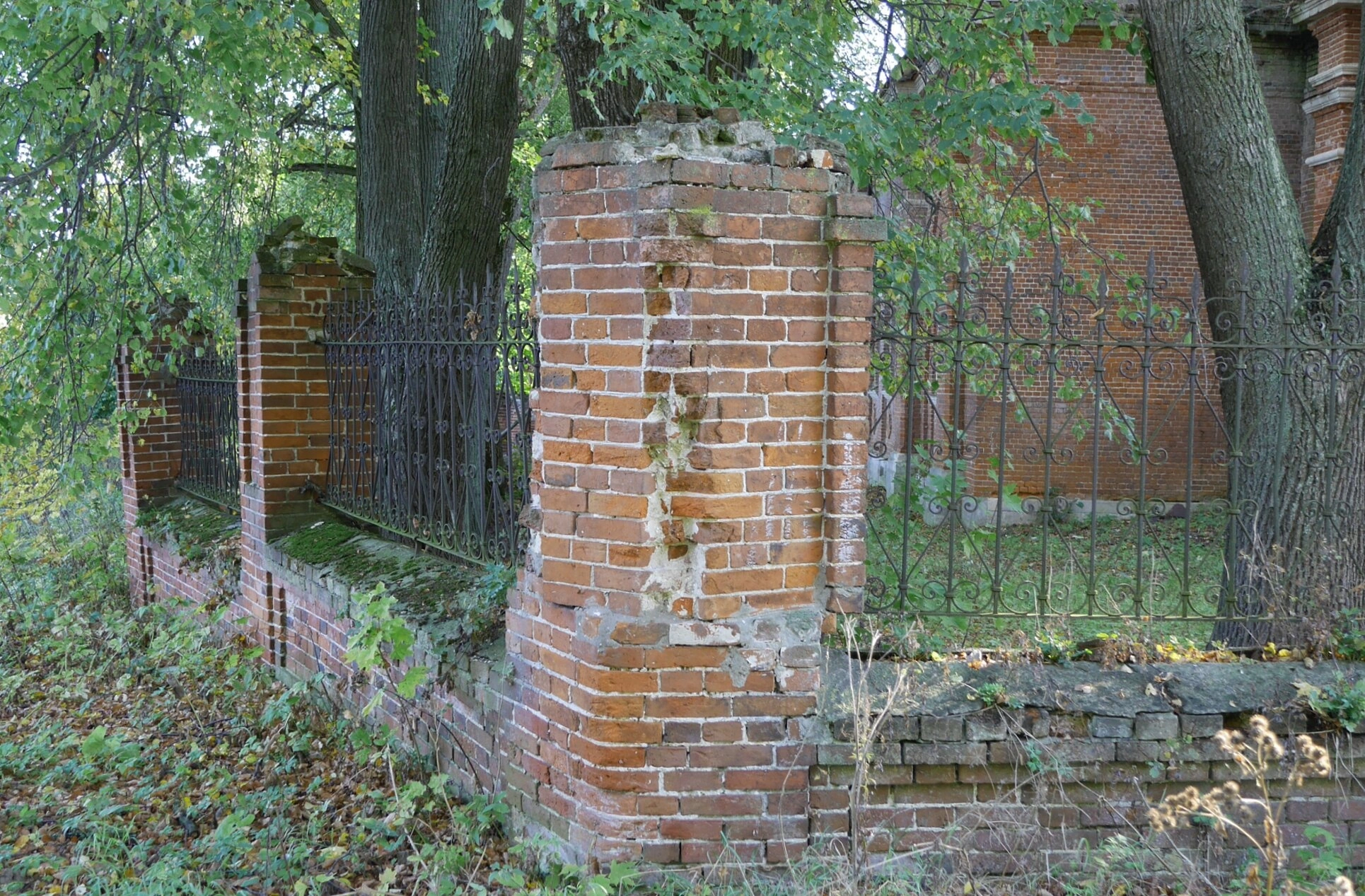 На представленной фотографии запечатлена историческая ограда Церкви во имя Преподобного Сергия Радонежского, расположенной в городе Ступино Московской области. Кирпичное ограждение с коваными металлическими решётками, окружающее храмовый комплекс, находится в состоянии, требующем реставрационных работ.
