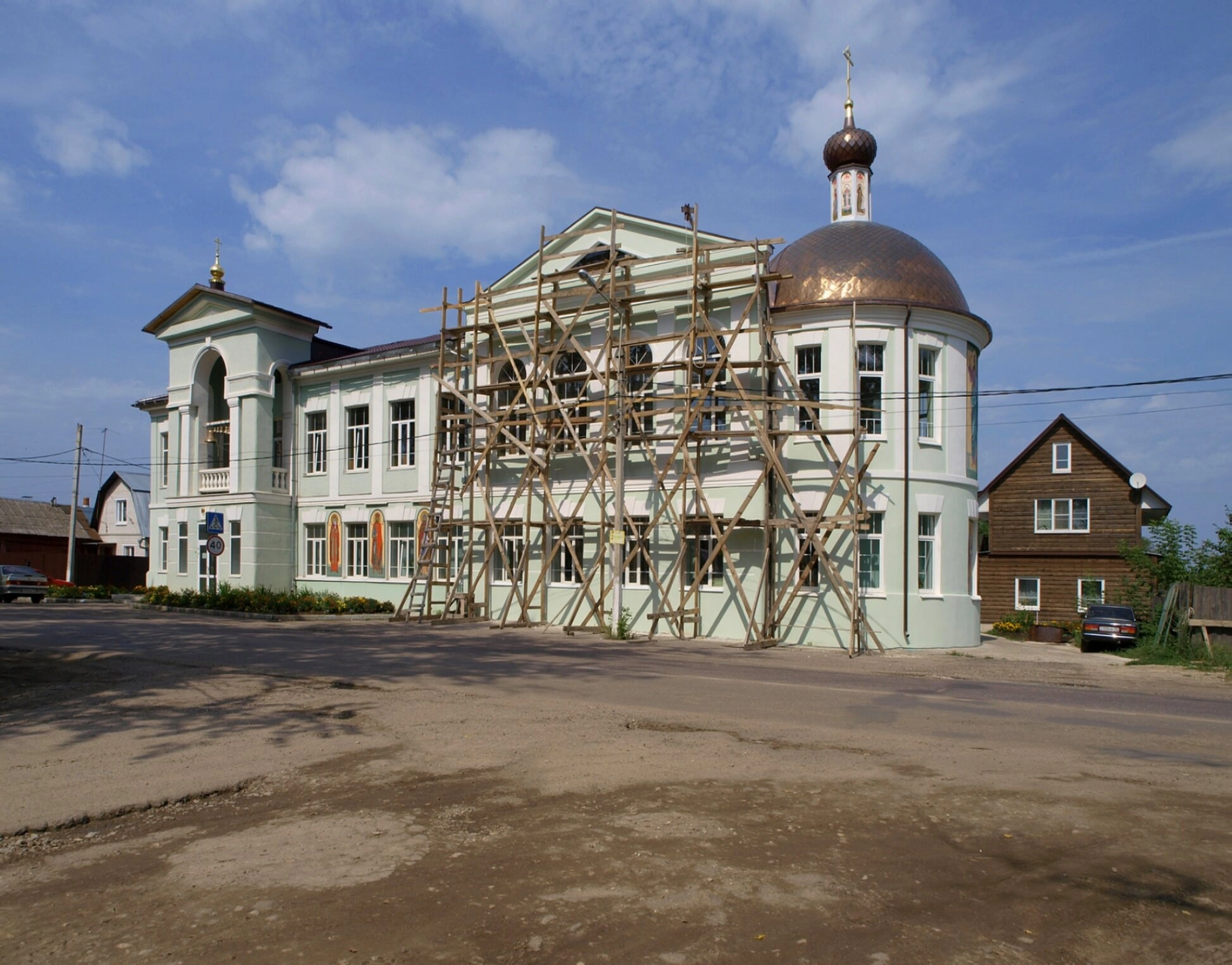 На представленной фотографии запечатлено здание Церкви-школы во имя святителя Николая Чудотворца в городе Павловский Посад Московской области. Храм находится в процессе реставрационных работ, о чём свидетельствуют установленные строительные леса.