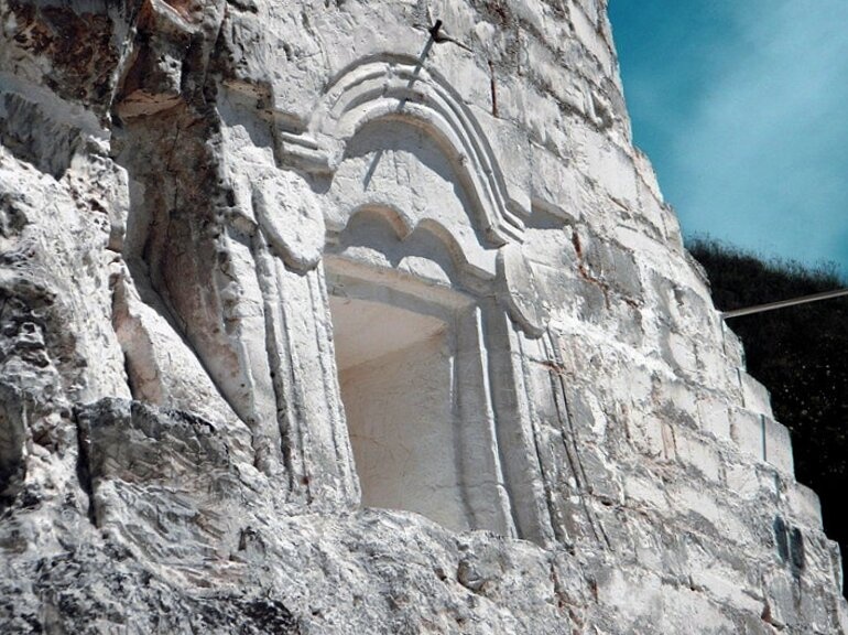 В центре композиции виден арочный проём, который может быть входом в святыню или оконным проёмом, освещающим внутренние помещения. Проём обрамлён лаконичными декоративными элементами, также вырезанными непосредственно в мелу, что подчёркивает органичное единство творения человеческих рук и природного ландшафта. Данный архитектурный комплекс был создан иноками в середине XVII века и служил местом уединённой молитвы и подвижничества.