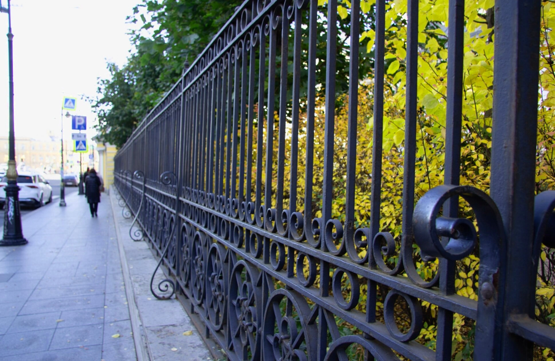Церковная ограда, изображённая на снимке, представляет собой архитектурный элемент, гармонично дополняющий ансамбль всего храмового комплекса. Чугунное литьё, характерное для многих церковных оград Санкт-Петербурга, демонстрирует высокое мастерство русских литейщиков. Ажурные элементы решётки сочетают в себе как функциональное назначение ограждения священной территории, так и декоративную функцию, подчёркивая благолепие дома Божия.