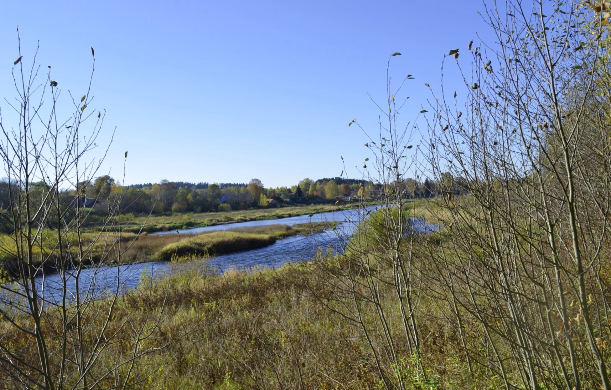 Извилистая гладь реки Тверцы, протекающей у подножия храма, отражает чистую голубизну небес и золото осеннего леса. Пологие берега, украшенные сухой травой и кустарниками, подчеркивают естественную красоту этого святого места. На заднем плане виднеется лесной массив, где деревья облачились в праздничные осенние одежды желто-оранжевых тонов.