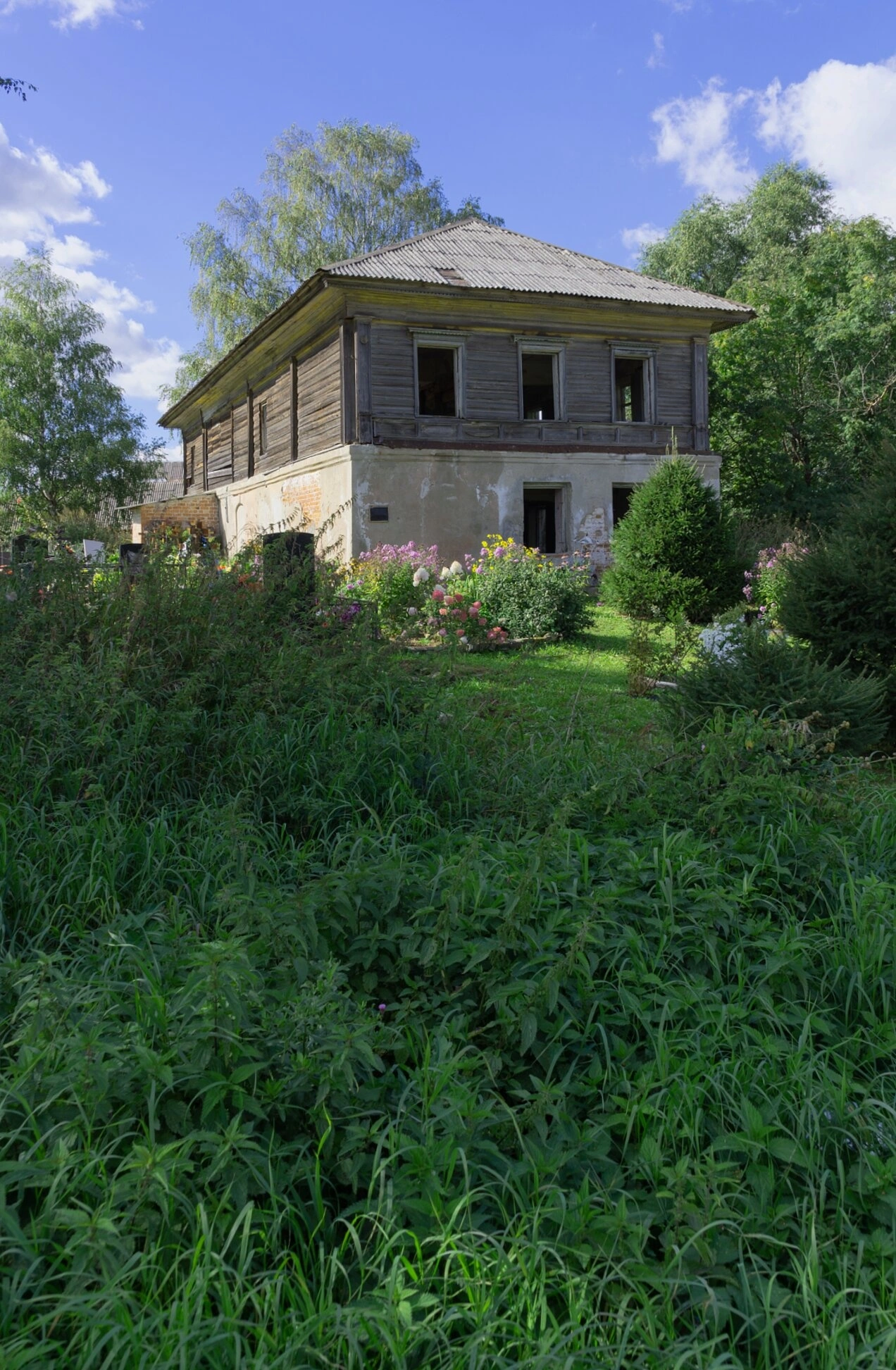 На представленной фотографии запечатлено историческое здание, относящееся к комплексу Церкви Смоленской иконы Божией Матери в деревне Гзино Ярославской области. Данное строение, расположенное на возвышенности, ранее служило церковно-приходской школой, что подтверждается архивными данными.