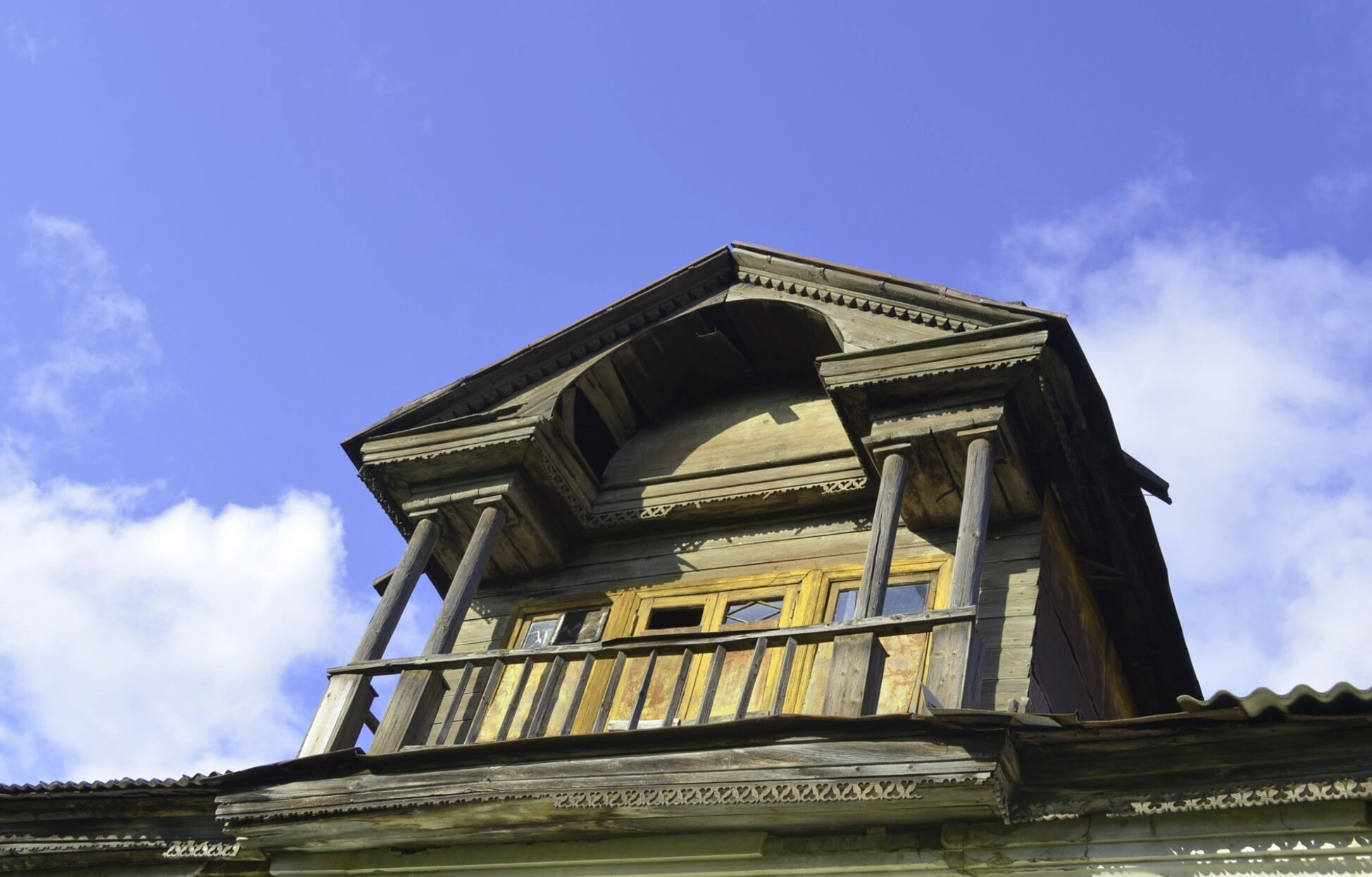 На представленной фотографии запечатлена верхняя часть деревянной церковной постройки - придел или звонница храма в честь Смоленской иконы Божией Матери в селе Гзино Ярославской области. Святыня представляет собой выдающийся образец русского деревянного зодчества, сохранивший благодатную атмосферу православной архитектуры.