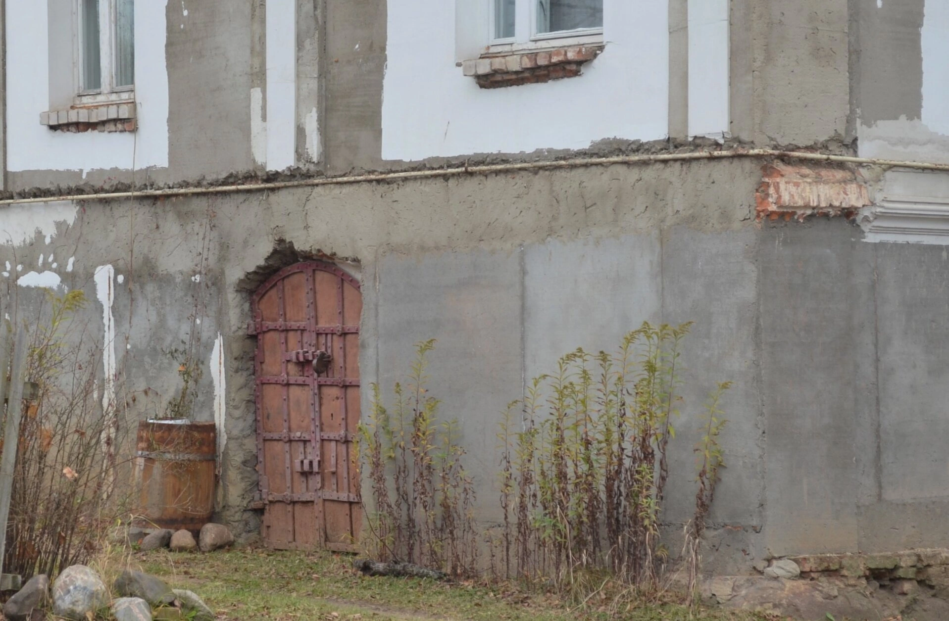 На снимке отчетливо виден фасад церковного здания, демонстрирующий характерные архитектурные элементы православного храмостроительства. Вход в святыню обрамлен старинной металлической дверью с художественными коваными элементами и массивным навесным замком, что свидетельствует о историческом возрасте постройки.