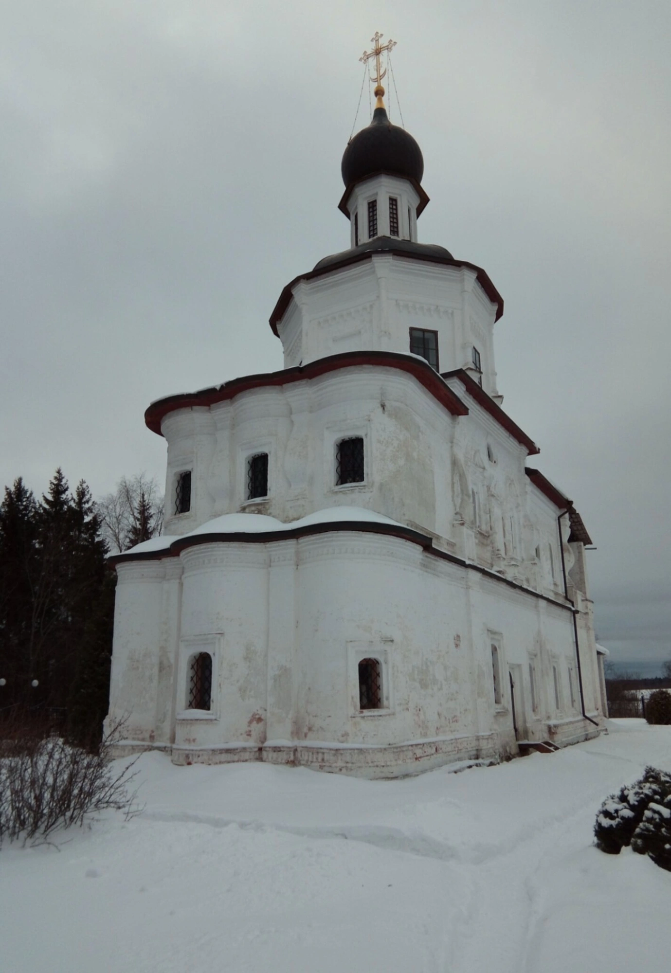 Зимний пейзаж придаёт фотографии особое настроение. Снежное покрывало мягко ложится на землю и кровлю храма, создавая атмосферу благоговейной тишины и умиротворения. Западный фасад здания, обращённый к зрителю, демонстрирует изящную симметрию архитектурных форм и тщательную проработку деталей.