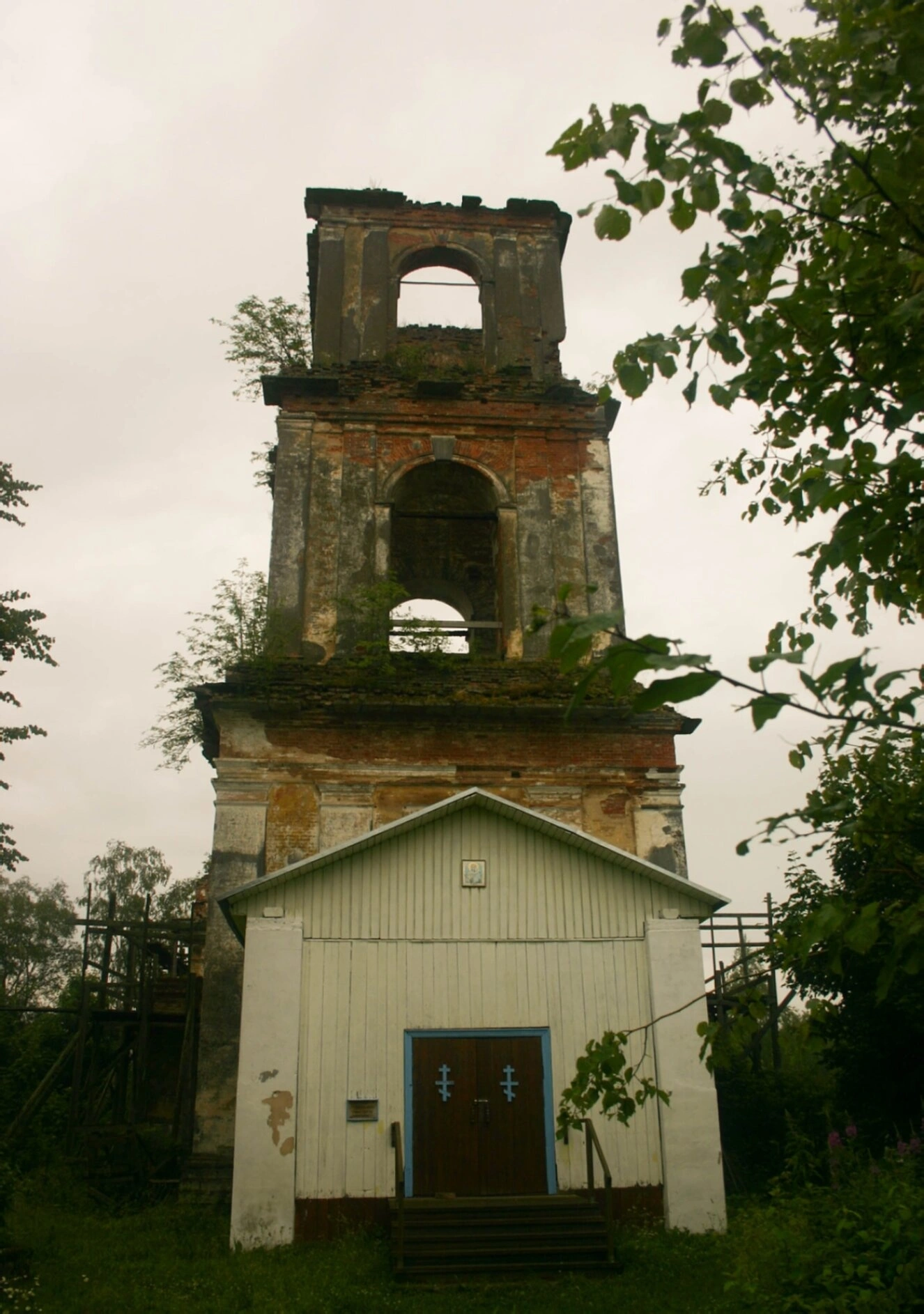 Центральным элементом снимка выступает колокольня, выстроенная из красного кирпича и несущая на себе явные следы запустения и разрушения. Верхние ярусы колокольни, где в прежние времена размещались колокола, частично утрачены, однако арочные проёмы ещё читаются в её структуре. К основанию колокольни примыкает скромная деревянная пристройка, служившая входом в храм; её двери украшены православными крестами.