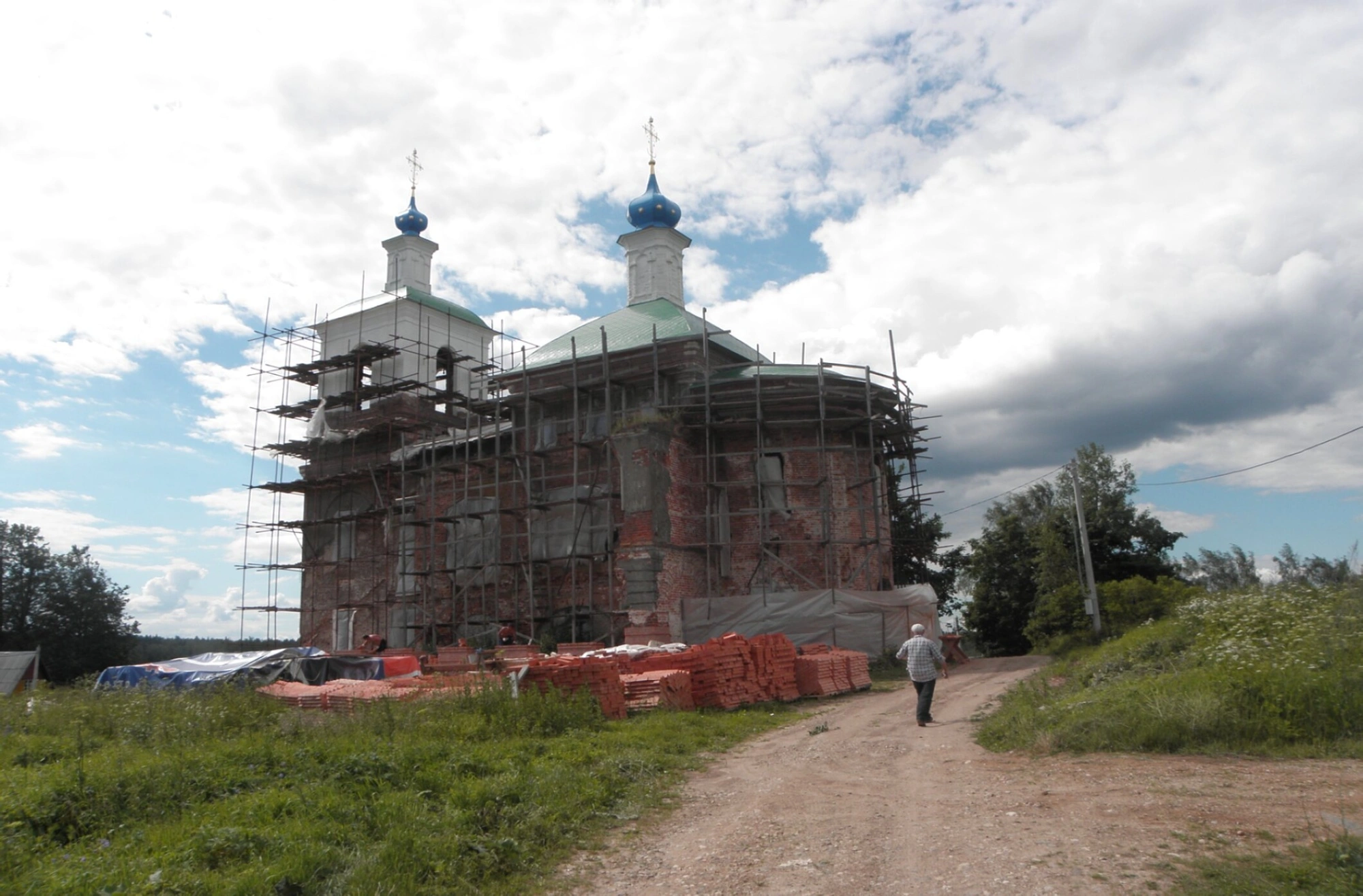 История этой святыни неразрывно связана с жизнью окрестных селений. В годы гонений на Церковь храм, как и многие другие, претерпел поругание и был закрыт, но избежал полного разрушения. В начале XXI века силами верующих и благотворителей началось его постепенное возвращение к жизни. На фотографии зафиксирован один из ключевых моментов этого возрождения – комплекс работ по восстановлению внешнего облика и конструктивной прочности здания.