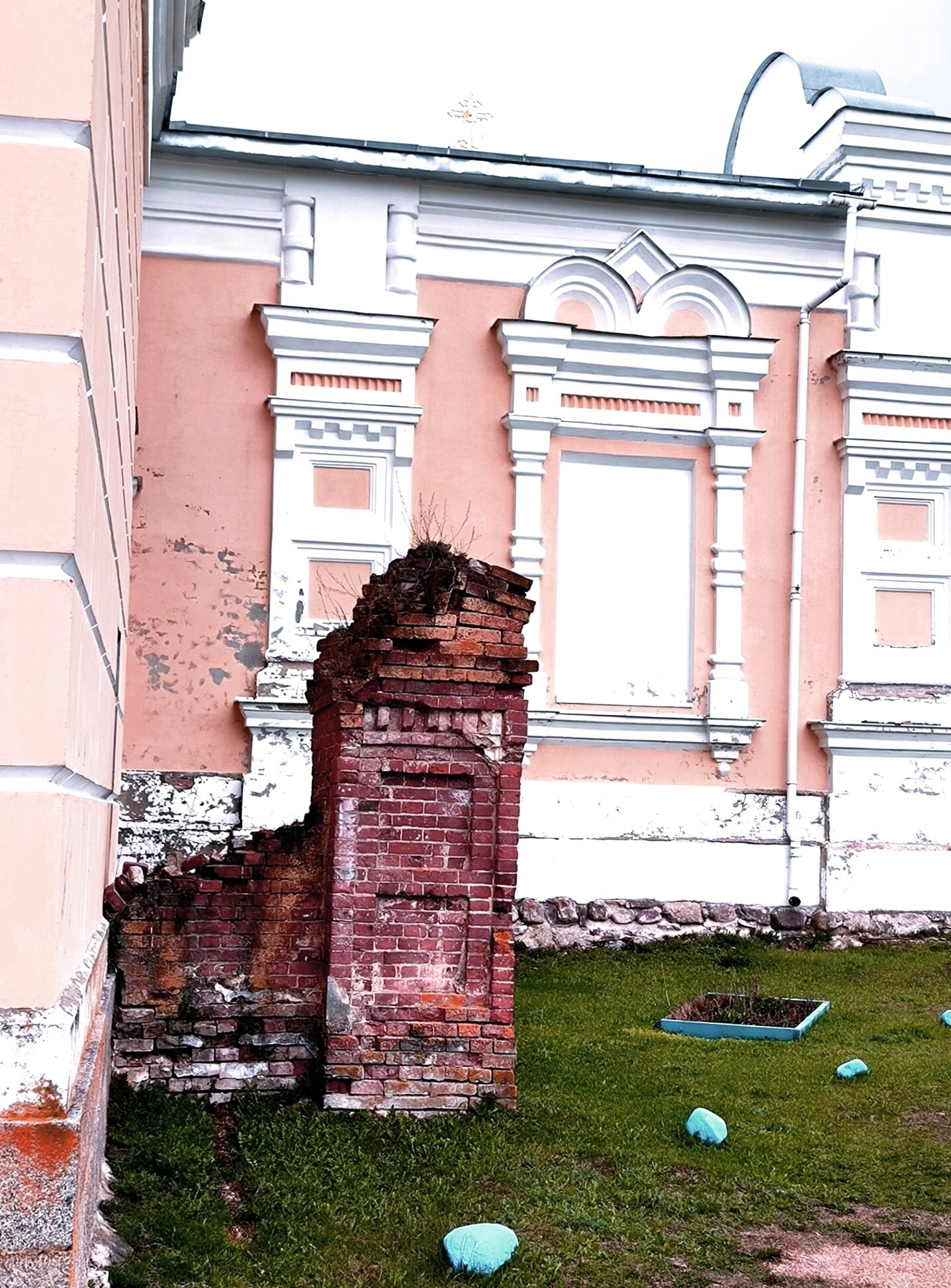 На переднем плане фотографии видны фрагменты старинной кирпичной кладки, свидетельствующие о почтенном возрасте святого места. Основное здание храма, увенчанное традиционным куполом, выполнено в желтых тонах с изящными белыми архитектурными деталями: карнизами, наличниками и пилястрами. Арочные оконные проемы, часть из которых ныне заложена, придают фасаду особую благородную строгость.