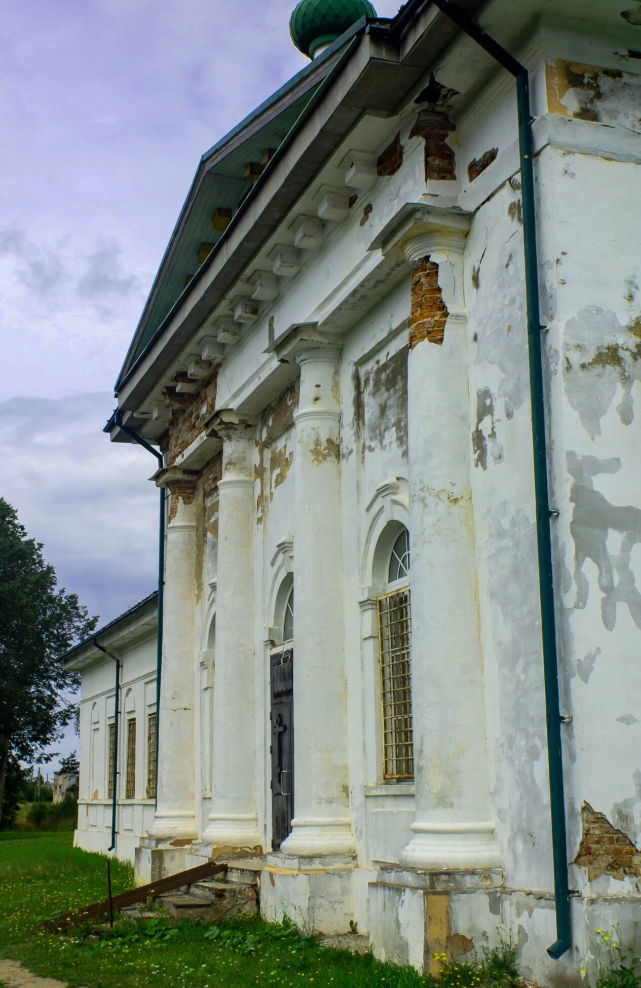 Фасад храма украшен изящными колоннами и пилястрами, которые подчёркивают вертикальную направленность архитектуры, устремлённость к горнему миру. Несмотря на видимые следы времени в виде облупившейся штукатурки и проступающей кирпичной кладки, сооружение сохраняет благородный вид и духовное величие. Водосточная труба, изображённая на снимке, является примером практических элементов, органично вписанных в архитектурный облик.