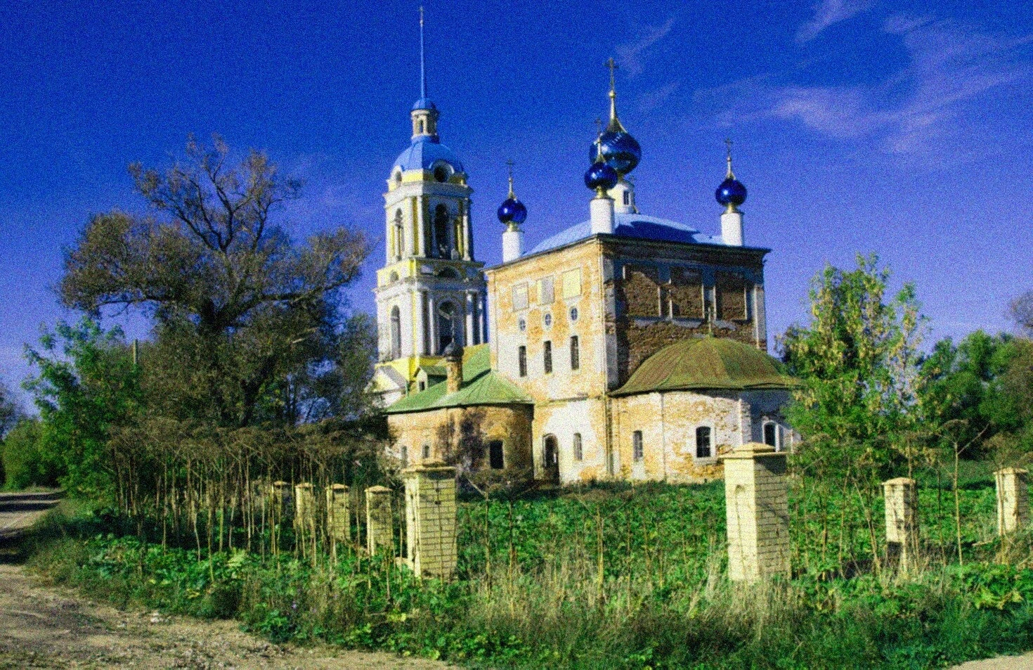 Фотография передаёт спокойную и умиротворённую атмосферу, окружающую храм. Церковь стоит на открытой территории, поросшей травой, а за ней виднеются кроны деревьев. Снимок, сделанный в ясный солнечный день, позволяет рассмотреть детали кирпичной кладки и насладиться контрастом стен с яркими синими куполами, увенчанными золотыми крестами, устремлёнными в голубое небо.
