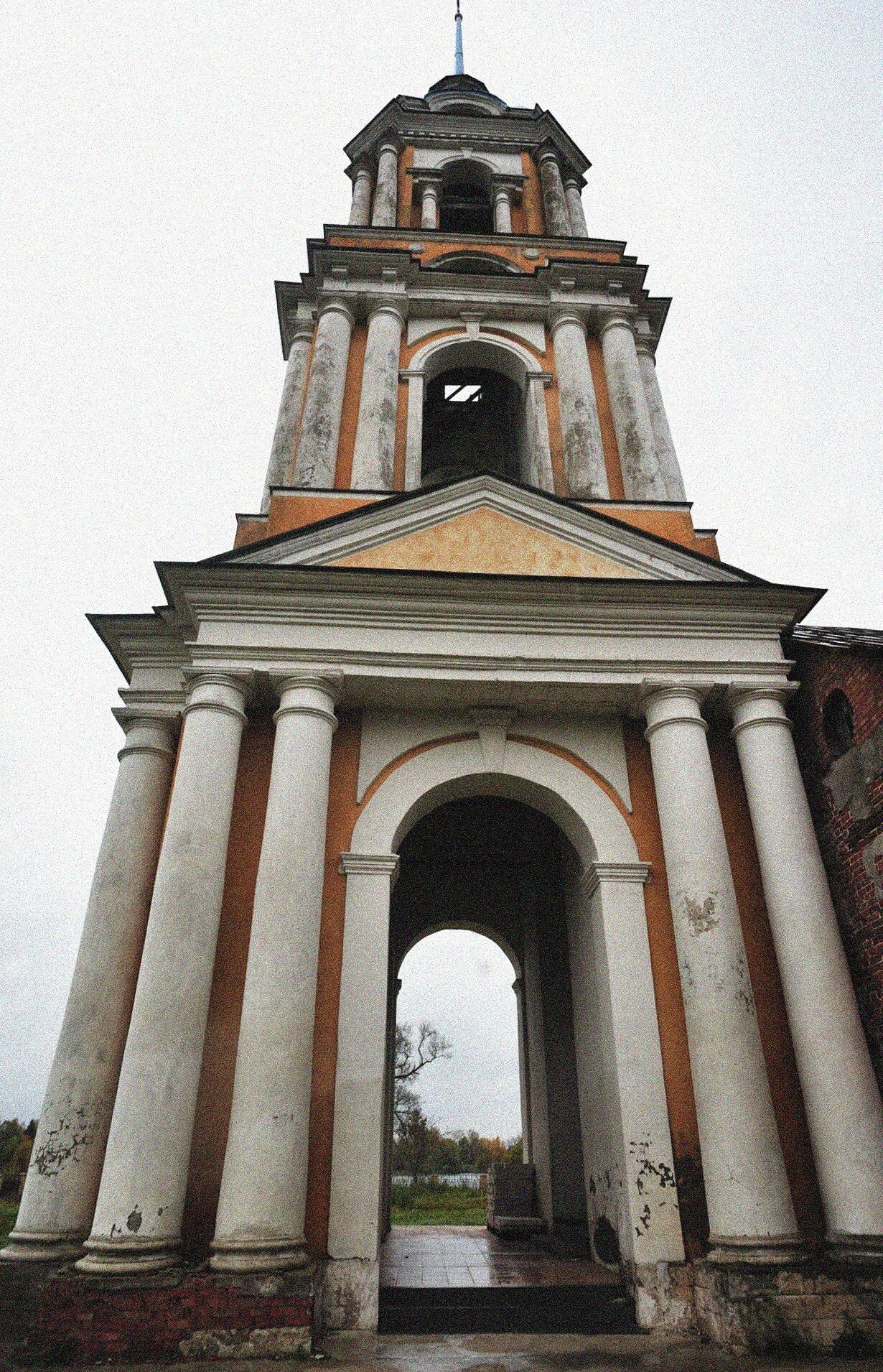На фотографии запечатлена колокольня Церкви в честь Смоленской иконы Божией Матери, расположенной в селе Ильинское Кимрского района Тверской области. Это значительный православный храм, имеющий богатую историю и являющийся объектом культурного наследия.