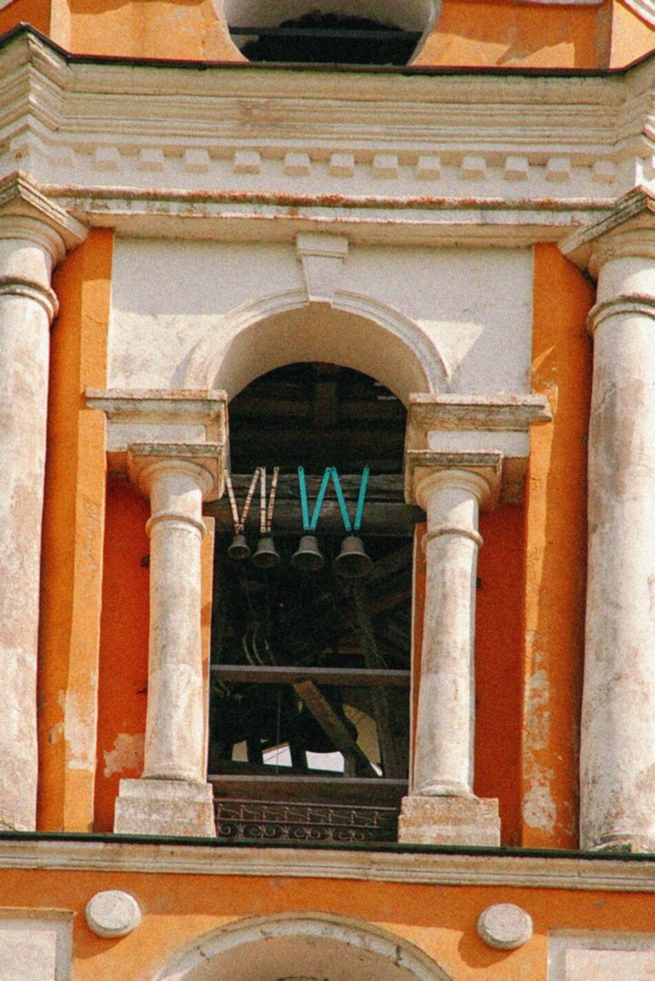 Колокольня, являющаяся композиционным центром снимка, демонстрирует характерные для церковной архитектуры того периода элементы: арочные проемы, колонны и стройный завершающий шпиль. В арочных проемах яруса звона можно различить подвешенные колокола, призывающие верующих на богослужение. Фасад сооружения имеет благородную патину времени, подчеркивающую историческую ценность этого духовного памятника.
