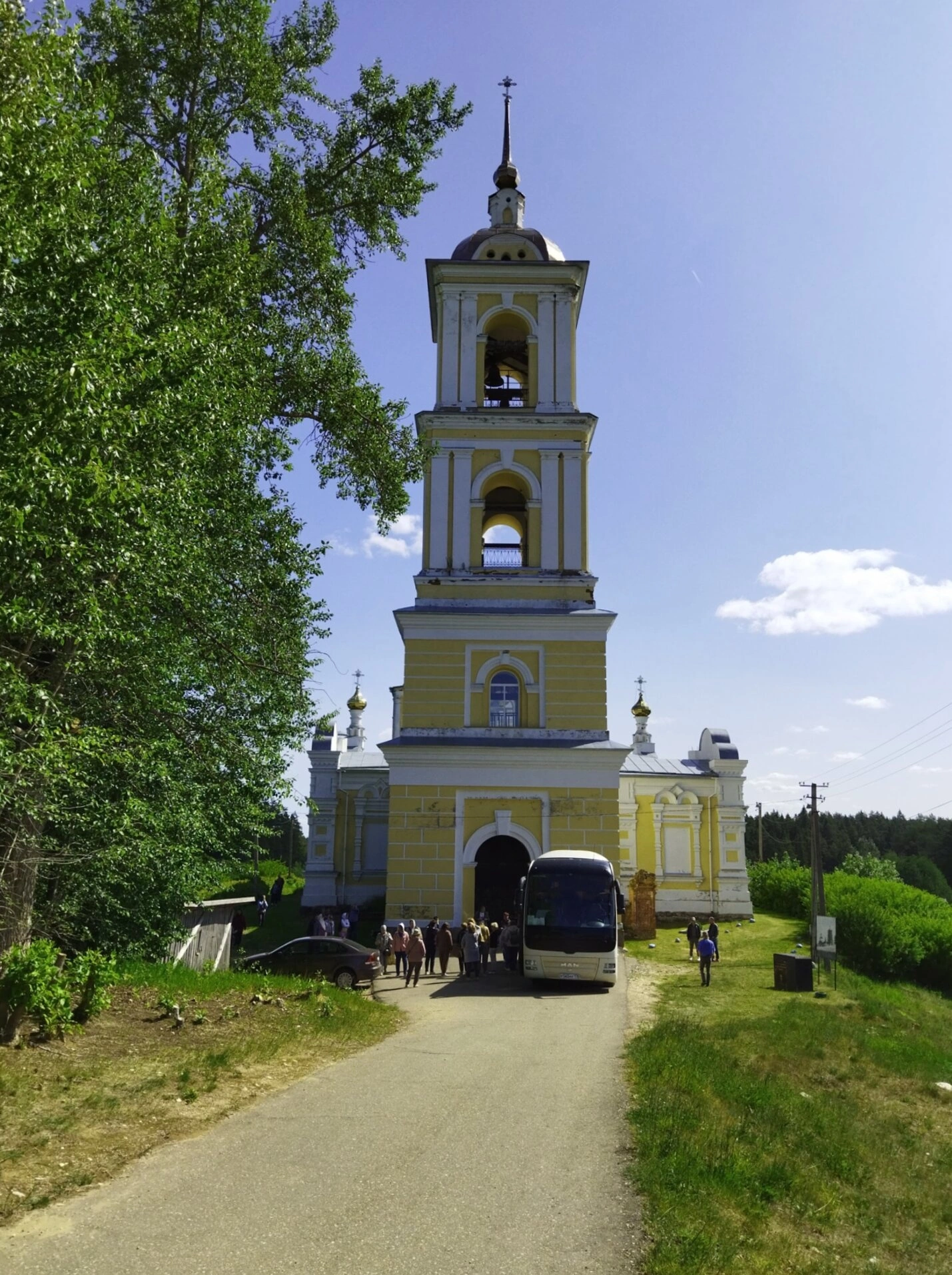 Перед святым местом, куда ведёт грунтовая дорога, останавливается туристический автобус с паломниками, желающими поклониться святыням и испросить благодатной помощи у чудотворного образа. Живописную природную среду вокруг храма составляют ухоженные зелёные насаждения и деревья, создающие атмосферу умиротворения и молитвенного покоя. Снимок сделан в ясный солнечный день, что подчёркивает величие и духовную радость, исходящую от этого благодатного места.