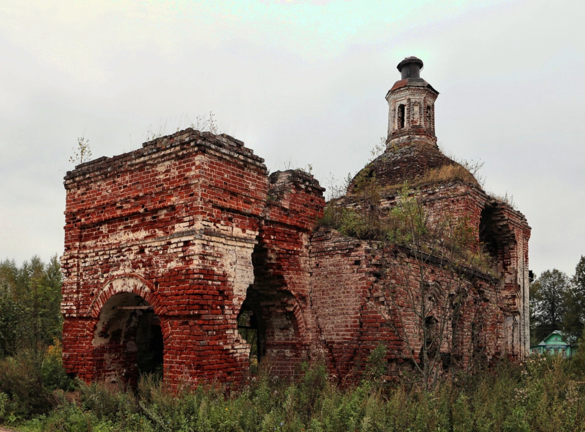 На представленной фотографии запечатлена Церковь Смоленской иконы Божией Матери, расположенная в окрестностях села Тюрюково Ивановской области. Ныне храм пребывает в скорбном, руинированном состоянии, являя собой молчаливый памятник ушедшей эпохи и непростой истории русского православия в XX столетии.