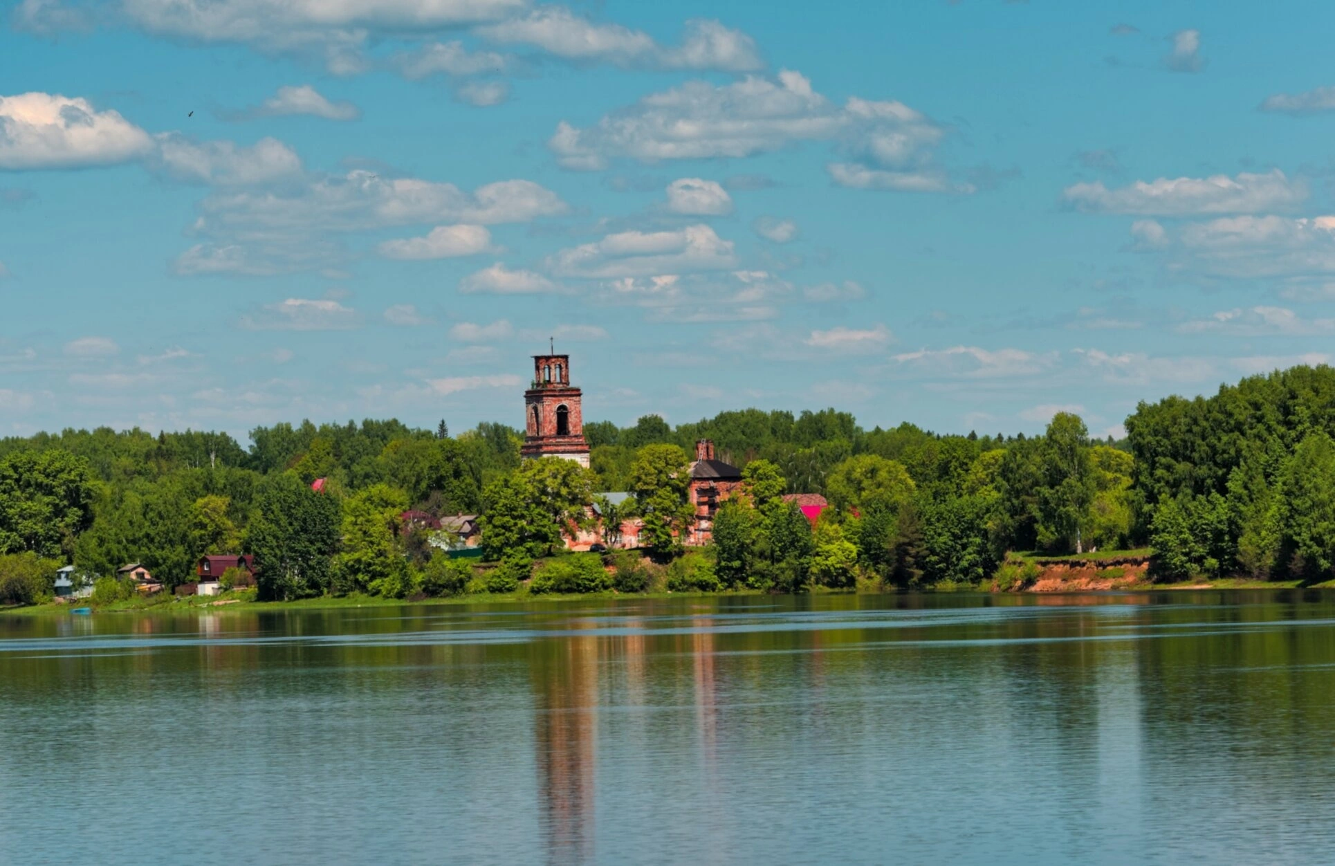 На представленной фотографии запечатлён величественный образ Церкви в честь Смоленской иконы Божией Матери, что расположена в старинном селе Устье на берегу реки Волги в Ярославской области. Храм гармонично вписан в окружающий природный ландшафт, стоя на возвышенности, что символично подчёркивает его духовную высоту.