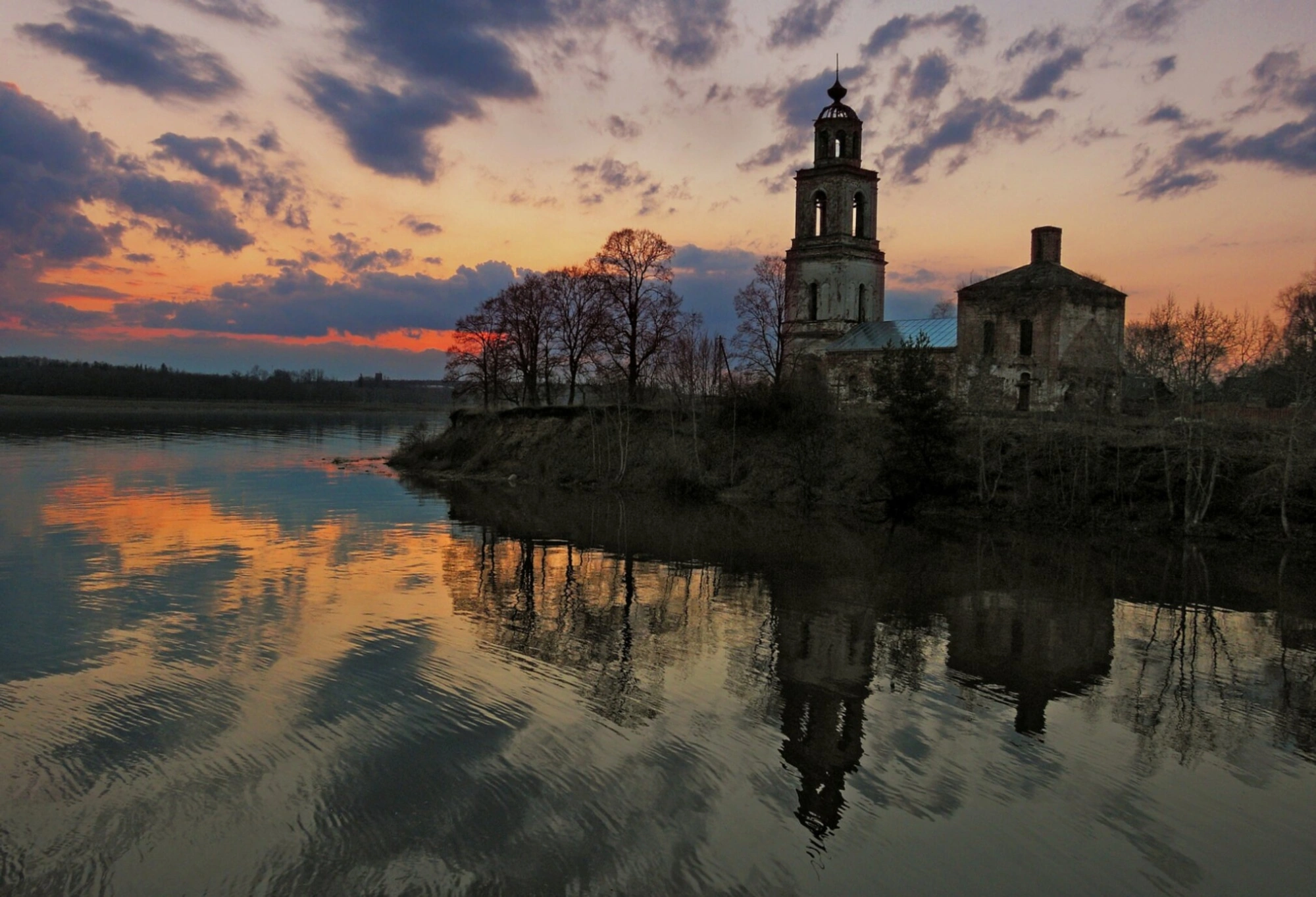 Снимок сделан в час заката, когда последние лучи солнца окрашивают небо в теплые тона, а спокойная водная гладь зеркально отражает и само здание с колокольней, и небесную высь. Этот эффект создаёт удивительно гармоничную и проникновенную картину, наполненную тихой грустью и благоговейным трепетом перед вечностью.