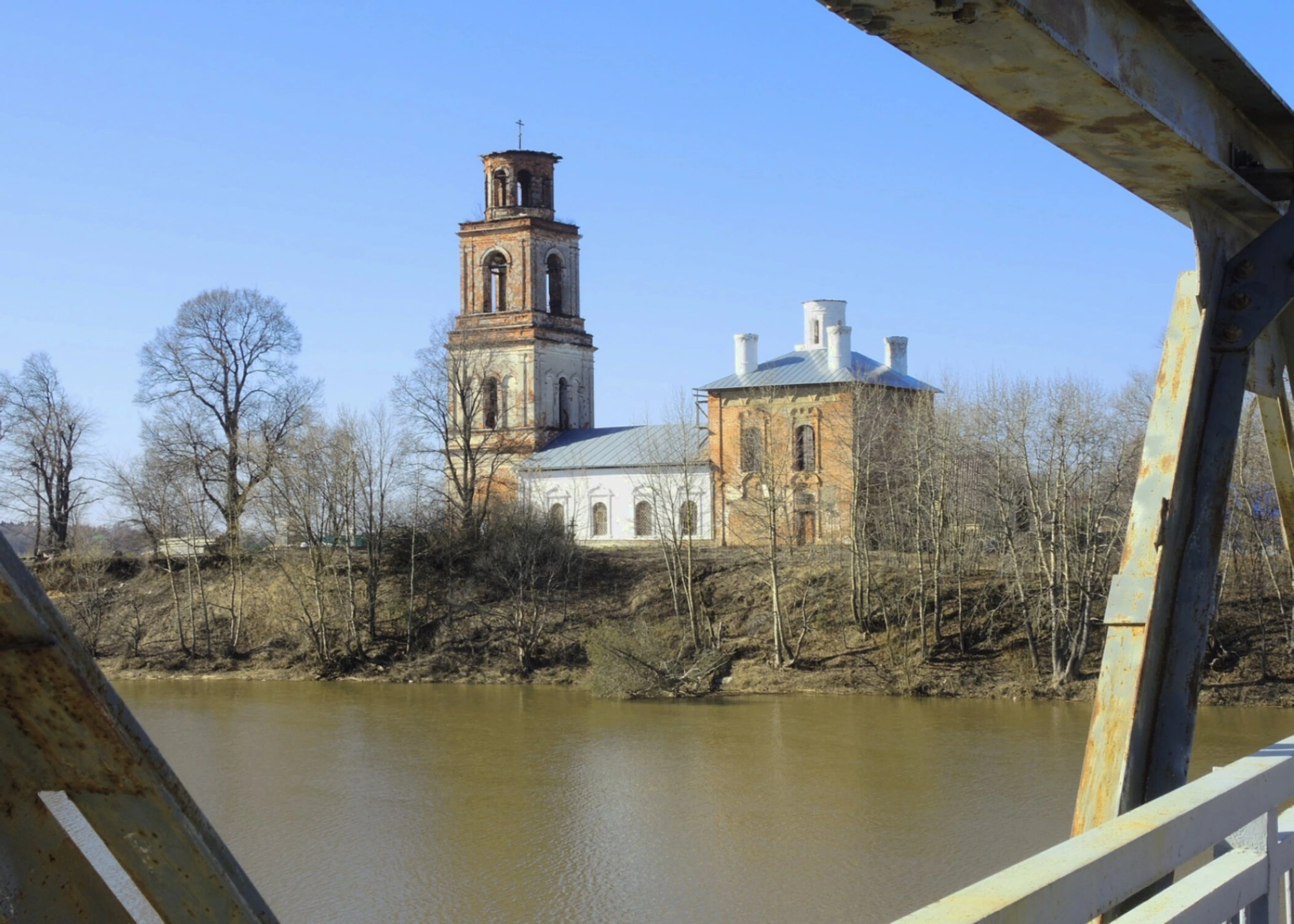 Снимок выполнен с уникального ракурса — с пешеходного моста, металлические конструкции которого обрамляют композицию, создавая эффект природной рамы и направляя взгляд зрителя на главную святыню. Река Корожечна, отражающая светлое небо, подчёркивает умиротворённость и благодатность этого места. Оголённые ветви деревьев, окружающих храм, указывают на раннюю весеннюю или позднюю осеннюю пору, что придаёт изображению особую, созерцательную атмосферу.
