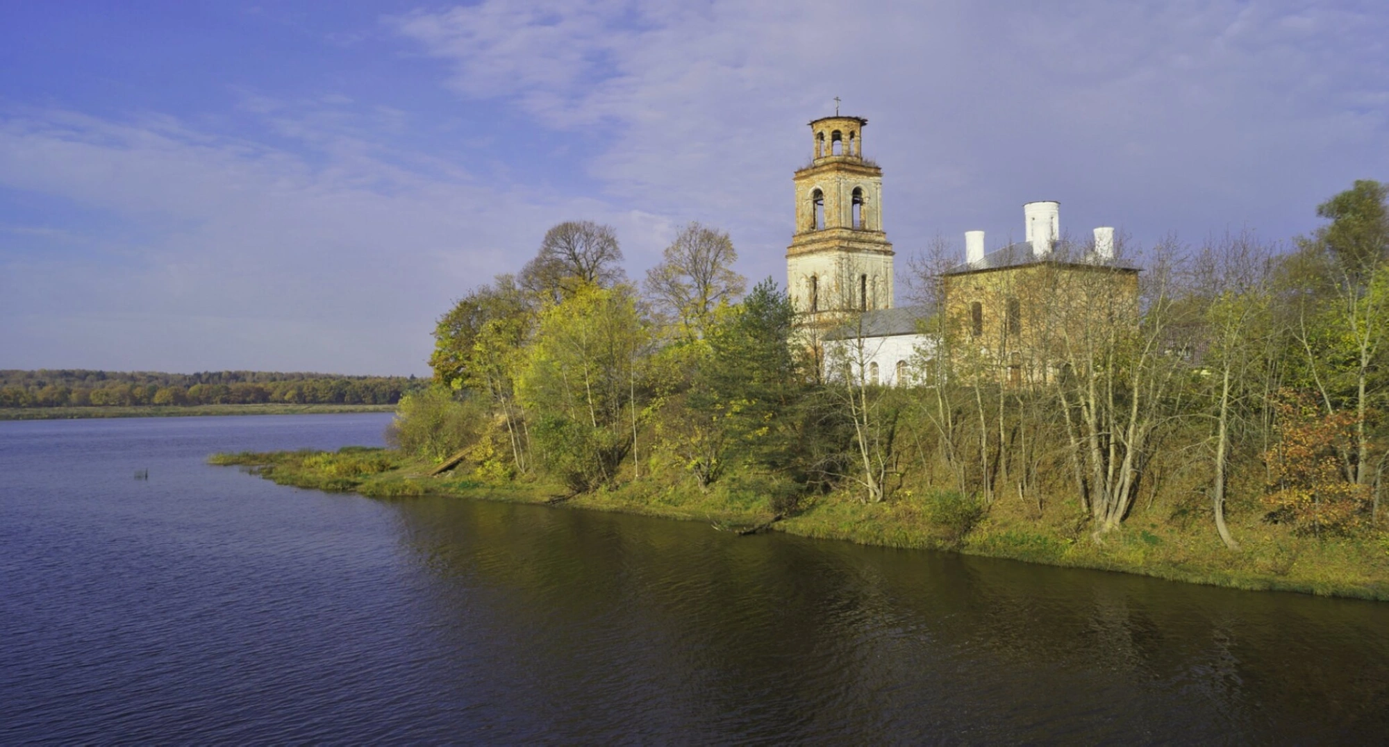 Снимок сделан в осенний период, о чём свидетельствует золотистая листва деревьев, обрамляющих береговую линию. Водная гладь водохранилища, отражающая небо, создаёт ощущение простора и умиротворения, подчёркивая уединённость и духовную значимость этого места. Церковь Смоленской иконы Божией Матери является не только архитектурным памятником, но и действующим православным храмом, притягивающим паломников и ценителей русской истории.