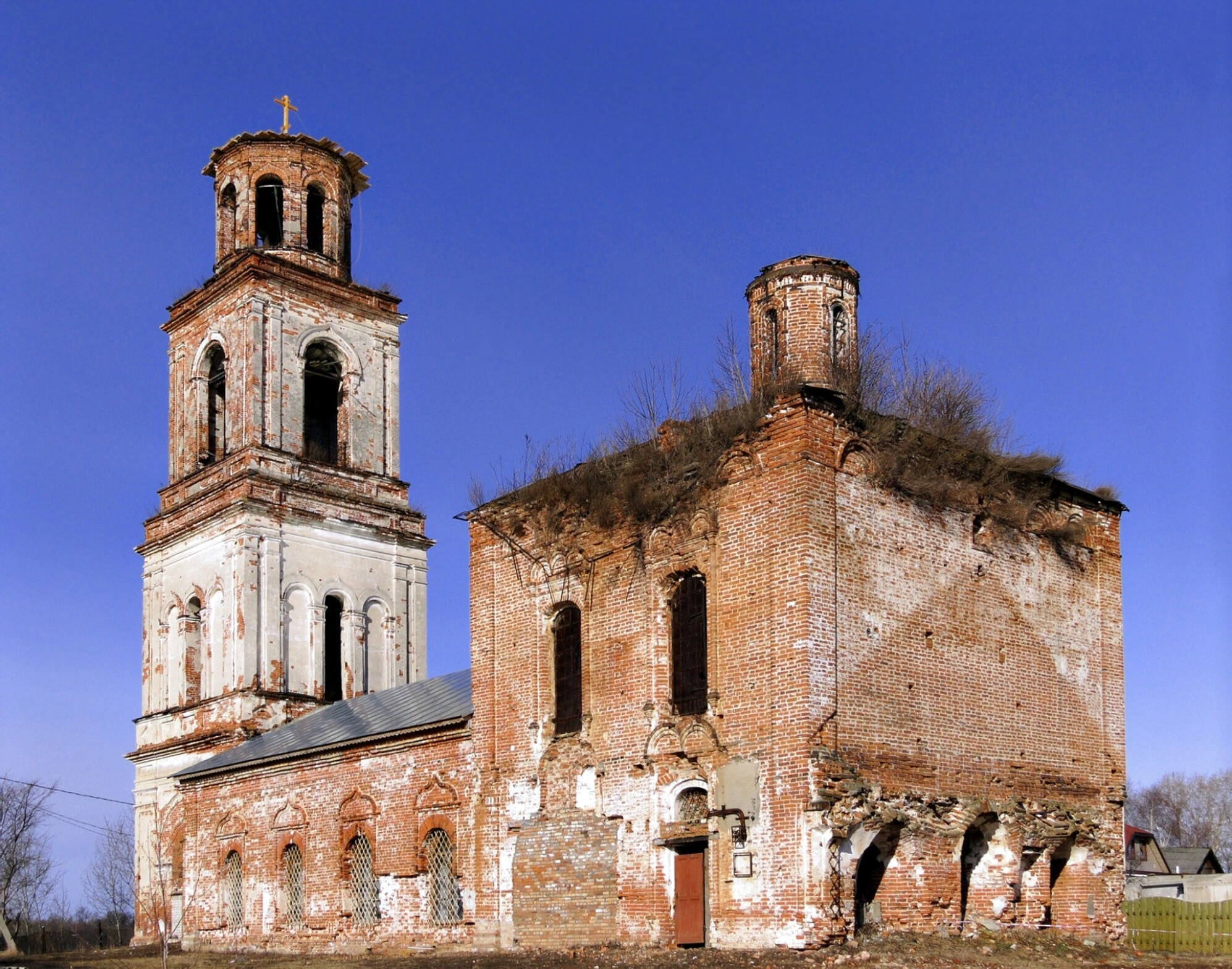 Многоярусная колокольня, доминирующая в архитектурной композиции, сохранила остатки штукатурного покрытия. На самом верхнем ярусе укреплен православный восьмиконечный крест, символически указывающий на предназначение сооружения даже в его нынешнем состоянии. На заднем плане фотографии виднеется сельский пейзаж с окружающими храм деревьями.