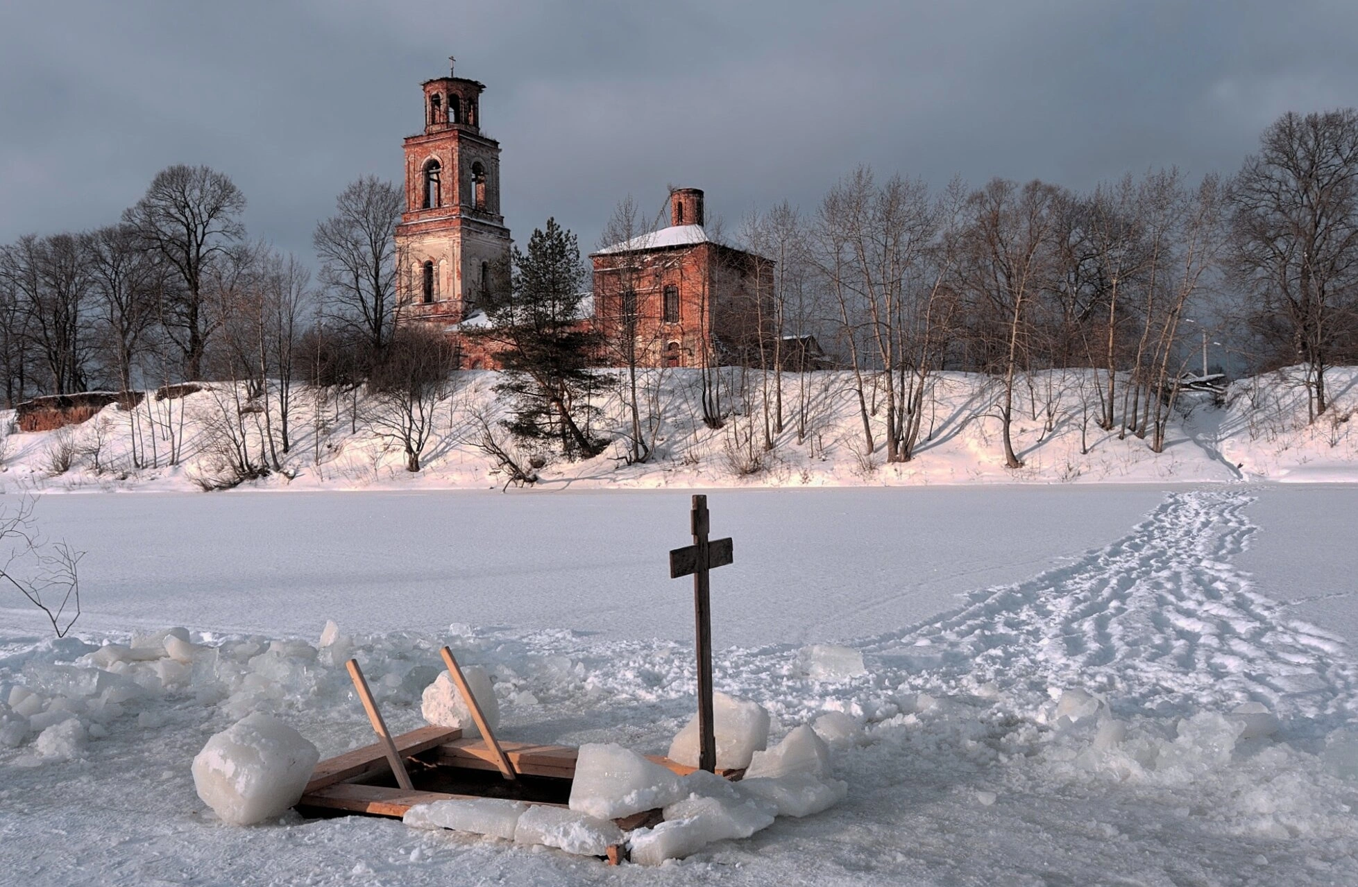 На представленной фотографии запечатлён величественный вид Церкви Смоленской иконы Божией Матери, что расположена в старинном селе Устье на берегу реки. Снимок сделан в один из главных православных праздников — Крещение Господне, о чём свидетельствует аккуратно вырубленная во льду реки прорубь — иордань, предназначенная для совершения великого водоосвящения и традиционных купаний верующих. Рядом с купелью установлен деревянный поклонный крест, а на снегу видны следы, говорящие о недавнем присутствии людей, пришедших совершить благочестивый обряд.