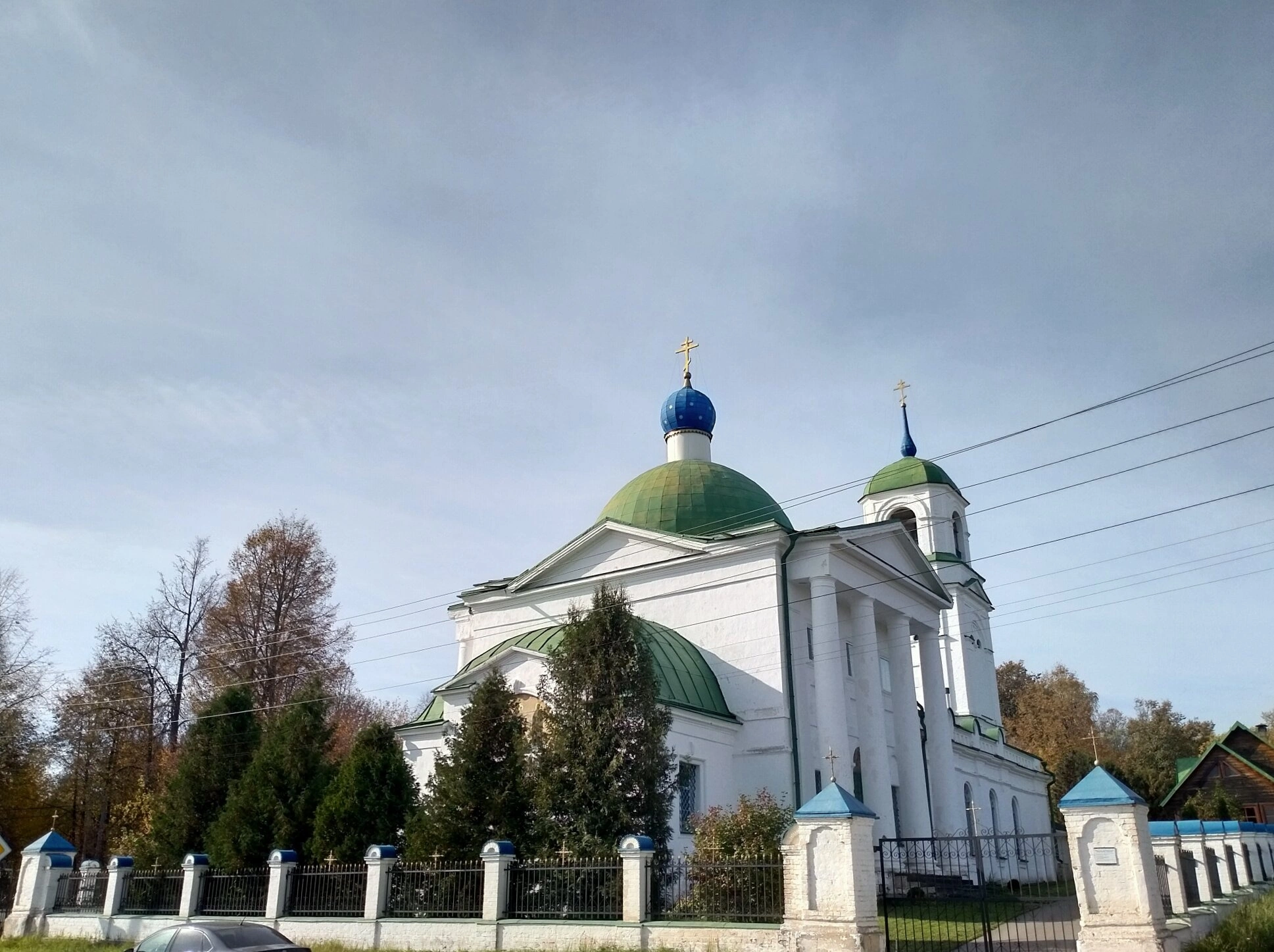 Храм окружён аккуратным чёрным металлическим забором на белом каменном основании, украшенным синими декоративными элементами. Осенняя пора, в которую сделан снимок, раскрасила листву окружающих деревьев в золотые и багряные тона, создавая живописный контраст с вечной зеленью хвойных пород. Пасмурное серое небо подчёркивает умиротворённость и сосредоточенность момента, переданного через фотографию.
