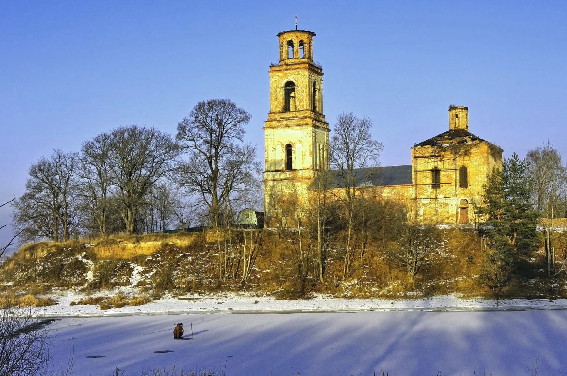 На фотографии запечатлён зимний пейзаж с Церковью Смоленской иконы Божией Матери, что располагается в старинном селе Устье на территории Ярославской области. Храм величественно возвышается на берегу замерзшего водоёма, его тёплые тона кирпичных стен создают выразительный контраст с холодной белизной снега и льда, озарённых мягким светом зимнего солнца.
