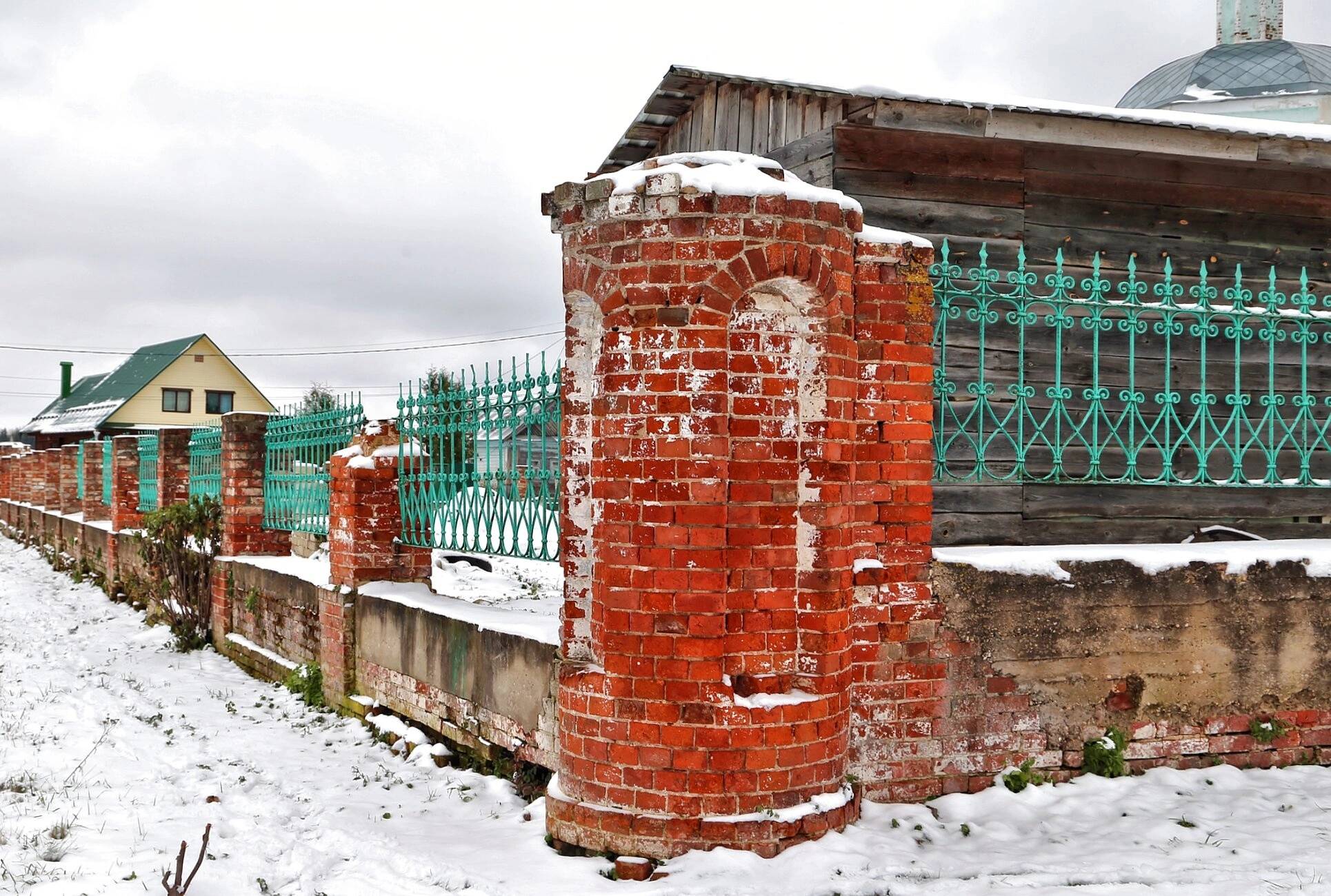 На представленной фотографии запечатлена территория Церкви Смоленской иконы Божией Матери в Ямской слободе (село Ям) в зимний период. На переднем плане виден полуразрушенный столб из старого красного кирпича с двумя арочными нишами, вершина которого и прилегающая низкая кирпичная стена покрыты снегом. Вдоль территории проходит ярко-бирюзовый металлический забор с ажурным орнаментом, установленный на кирпичном основании. За оградой просматривается часть деревянного строения храма, а на заднем плане слева — жилой дом с зелёной крышей. Вся сцена укрыта слоем снега, небо пасмурное, что указывает на зимний или поздний осенний день.
