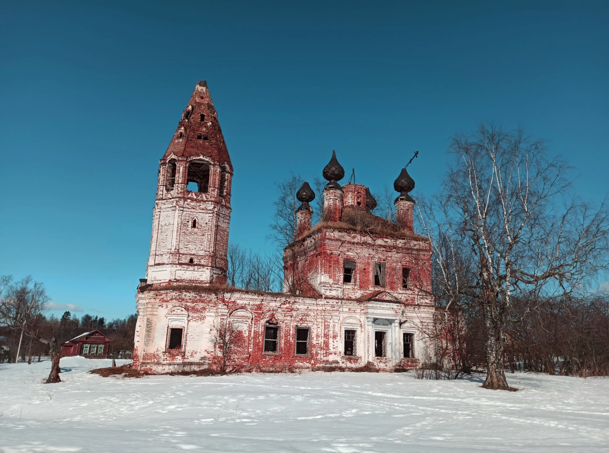 Фотография сделана в зимнее время. Архитектурный памятник возвышается посреди заснеженного поля, окружённый редкими деревьями, что подчёркивает его оторванность от современной жизни и забытость. Вокруг виднеются остатки других строений, некогда составлявших единый комплекс сельского погоста. Этот образ служит напоминанием о богатой духовной истории этих мест, берущей начало в XVII веке, и о необходимости сохранения нашего историко-культурного наследия.