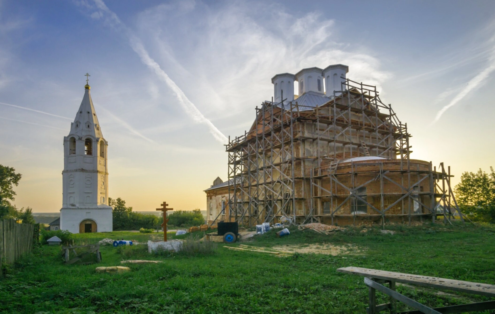 Основной храмовый объем, сложенный из красного кирпича, пребывает в стадии реставрационных работ, о чем свидетельствуют установленные строительные леса. Архитектурный ансамбль включает в себя несколько куполов, традиционных для православного церковного зодчества. Рядом с главным зданием возвышается колокольня, выполненная в белых тонах и увенчанная высоким шпилем. Колокольня имеет ухоженный вид и, вероятно, уже прошла процесс восстановления.
