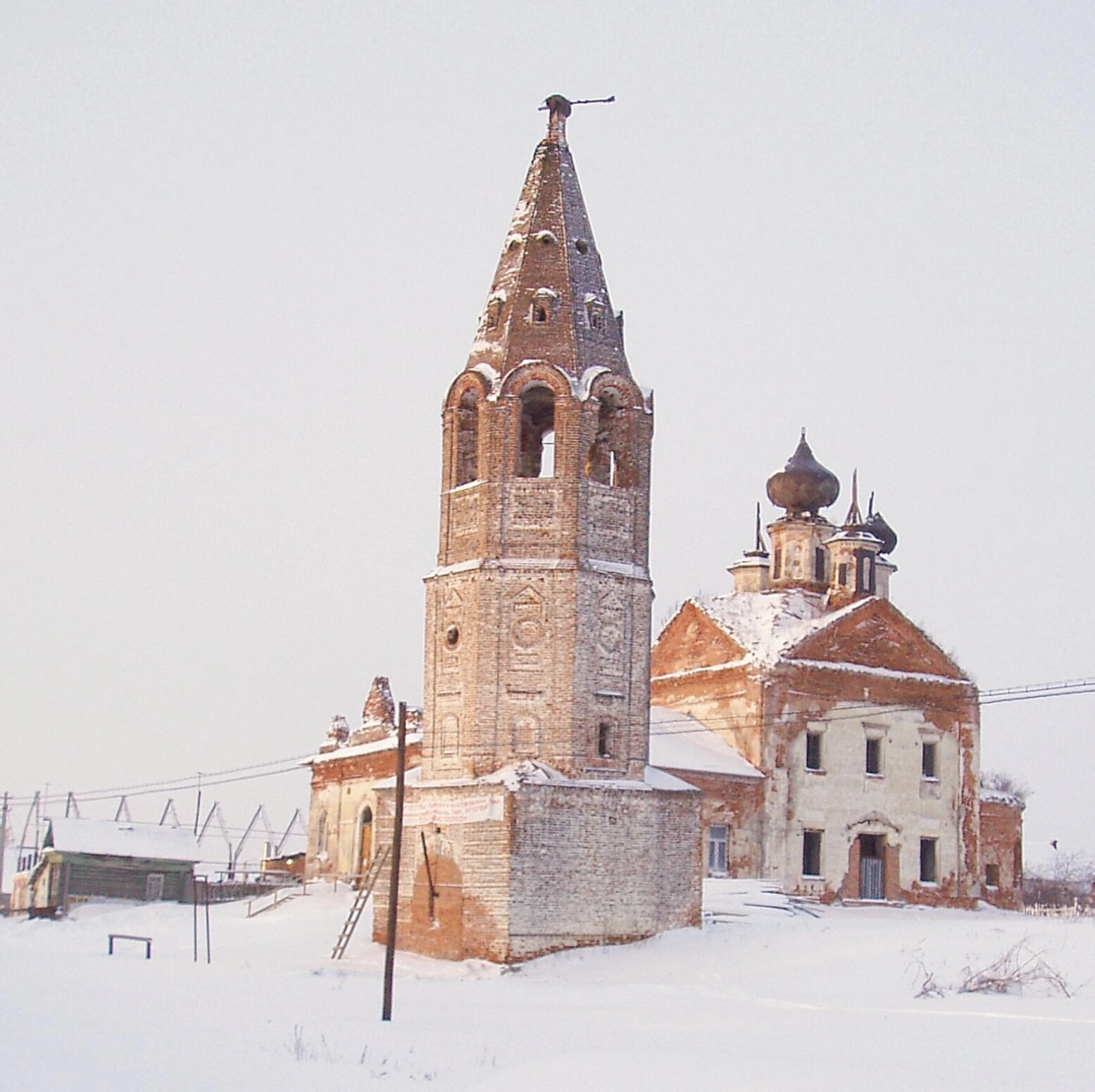 Окружающий пейзаж передает атмосферу русского села: традиционные деревянные постройки, линии электропередач, заснеженные просторы. Пасмурная зимняя погода создает особое настроение, напоминая о сложной судьбе православных святынь в России XX века. Фотография служит ценным документом, сохраняющим образ храма в его нынешнем состоянии для будущих поколений.