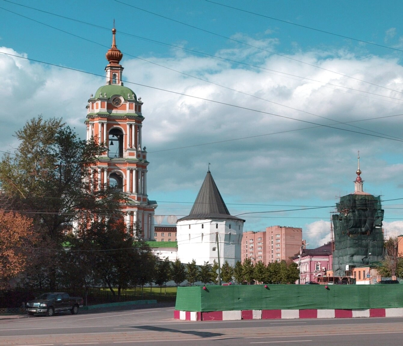 Церковь Сорока Мучеников исторически связана с Новоспасским монастырём, основанным в XIII веке святым благоверным князем Даниилом Московским. Храм располагается на территории, издревле принадлежавшей монастырю, и является важной частью православного архитектурного ансамбля столицы. На заднем плане фотографии видны современные городские постройки, что подчёркивает гармоничное соседство древней святыни с динамичной жизнью мегаполиса.