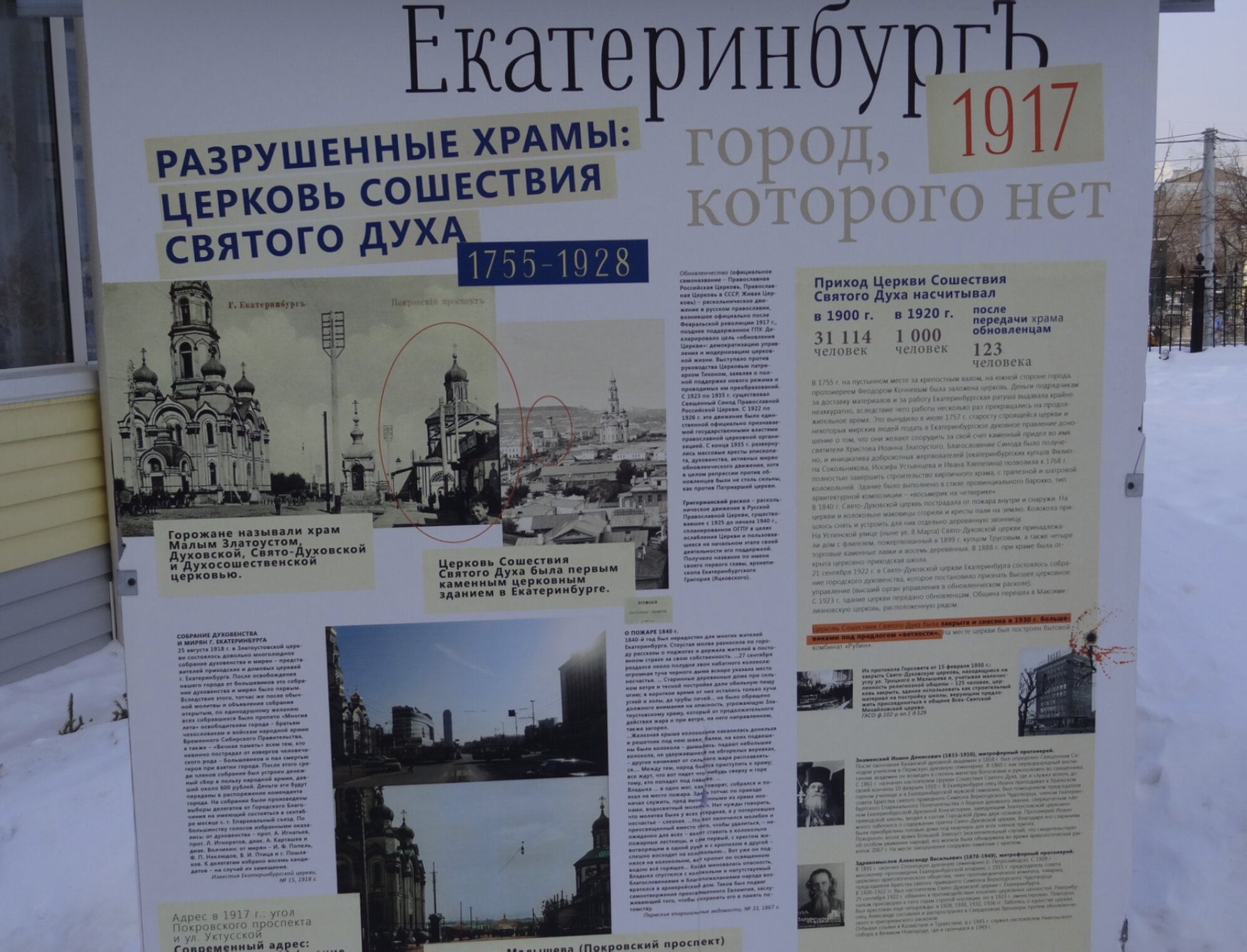 На представленной фотографии запечатлен информационный стенд, установленный на территории Свято-Троицкого кафедрального собора в Екатеринбурге. Данный мемориальный объект посвящен памяти утраченных православных святынь города, особое внимание уделяя Церкви Сошествия Святого Духа, известной в народе как Малый Златоуст.