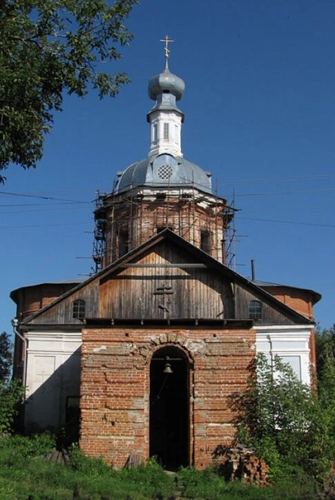 Здание церкви, выполненное из красного кирпича, демонстрирует традиционные для русского храмового зодчества формы. На момент съёмки храм находится в стадии реставрации, о чём свидетельствуют установленные строительные леса, частично скрывающие купол, увенчанный благодатной луковичной главой и православным крестом. Подобные работы направлены на сохранение исторического и культурного наследия для будущих поколений.