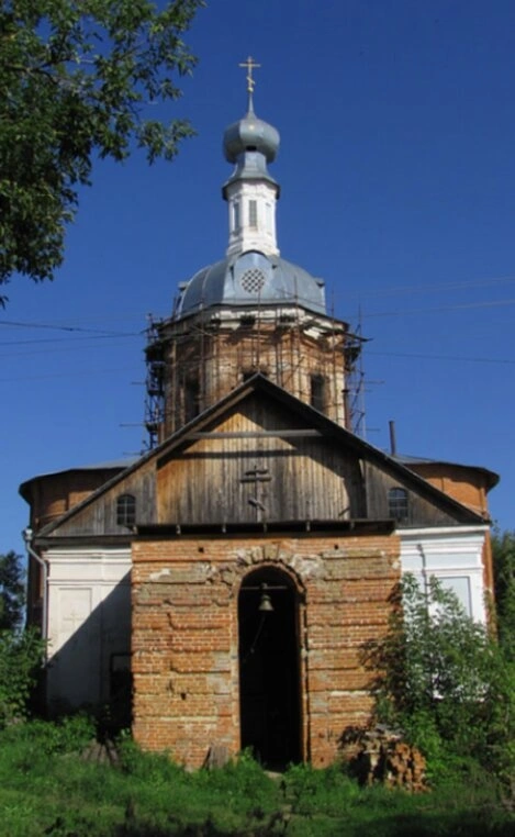 На представленной фотографии запечатлена Церковь Сошествия Святого Духа, расположенная в древнем селе Перемышль Калужской области. Этот православный храм, являющийся объектом культурного наследия, изображён в момент проведения реставрационных работ, о чём красноречиво свидетельствуют строительные леса, окружающие его главный купол.