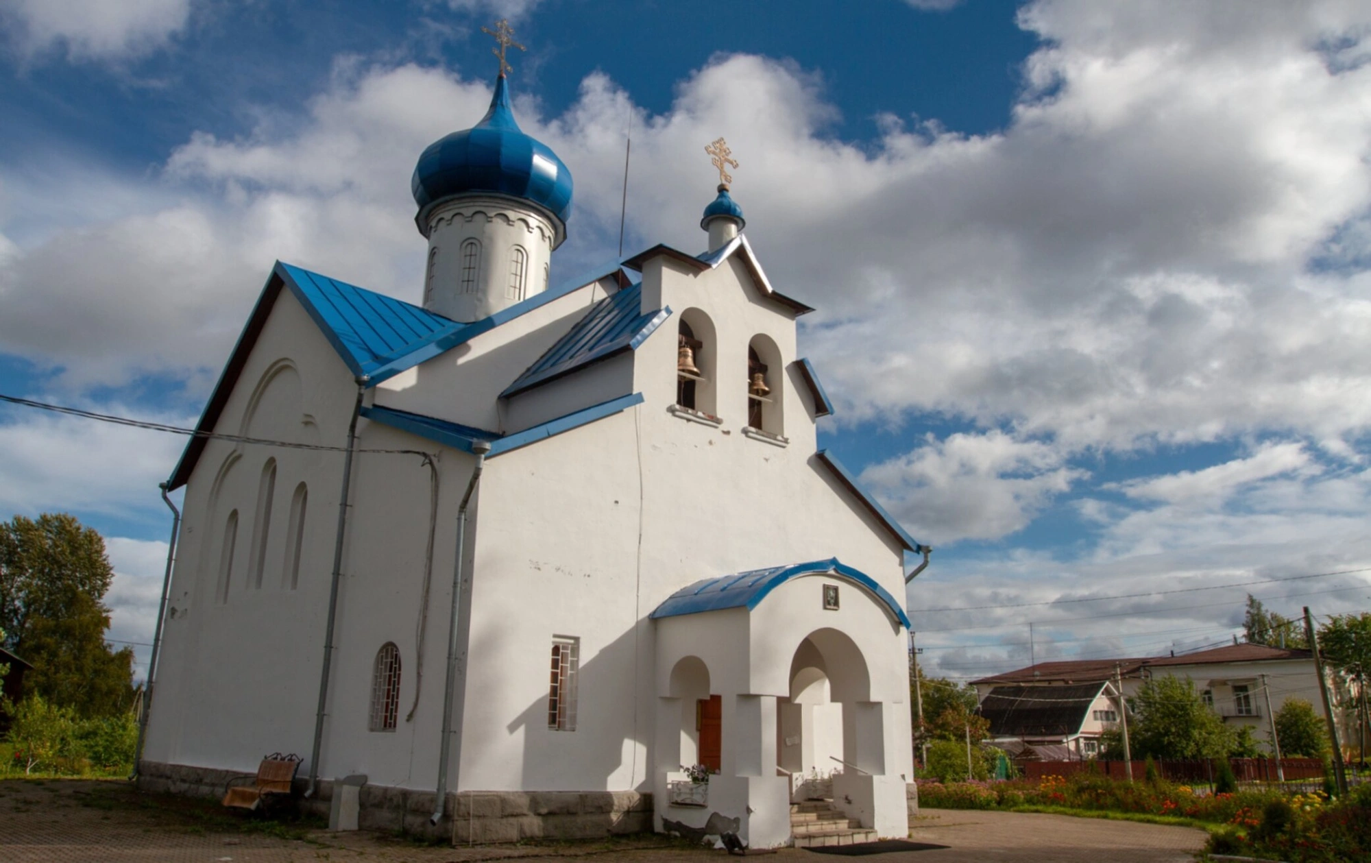 Фасад храма отличается строгостью и лаконичностью форм. Центральный вход украшен крыльцом с арочным проёмом, также выкрашенным в синий цвет. Территория вокруг церкви благоустроена: здание окружено зелёными насаждениями и ограждено невысоким забором. На заднем плане фотографии просматриваются другие строения посёлка, что позволяет оценить масштаб храма в окружающем ландшафте.
