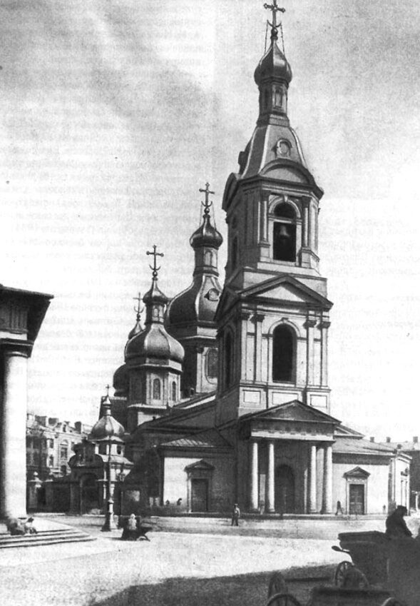 На исторической фотографии запечатлен величественный облик церкви Успения Пресвятой Богородицы, более известной в народе как Спас на Сенной. Этот православный храм был архитектурной доминантой Сенной площади в Санкт-Петербурге и являлся выдающимся памятником русского барокко середины XVIII столетия.