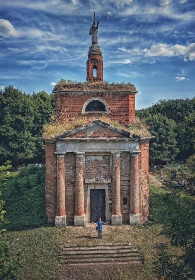 Особую атмосферу снимку придаёт окружающий храм летний пейзаж: густая зелень деревьев, окружающих церковь, и драматичное облачное небо. Фигура человека у входа позволяет оценить монументальность сооружения. В настоящее время ведутся работы по консервации и изучению памятника, что вселяет надежду на его будущее возрождение для молитвенной жизни.