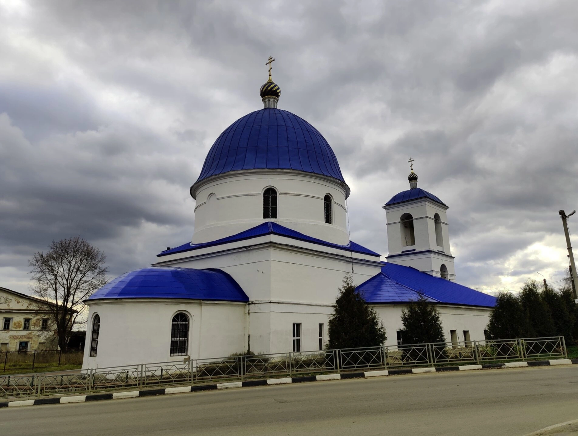 На переднем плане фотографии виден традиционный церковный забор, ограждающий священную территорию храма от суетного мира. Вокруг храма расположены деревья, создающие особую атмосферу умиротворения и духовного покоя. Отсутствие людей на фотографии позволяет в полной мере сосредоточиться на архитектурных достоинствах и духовном значении этого святого места.