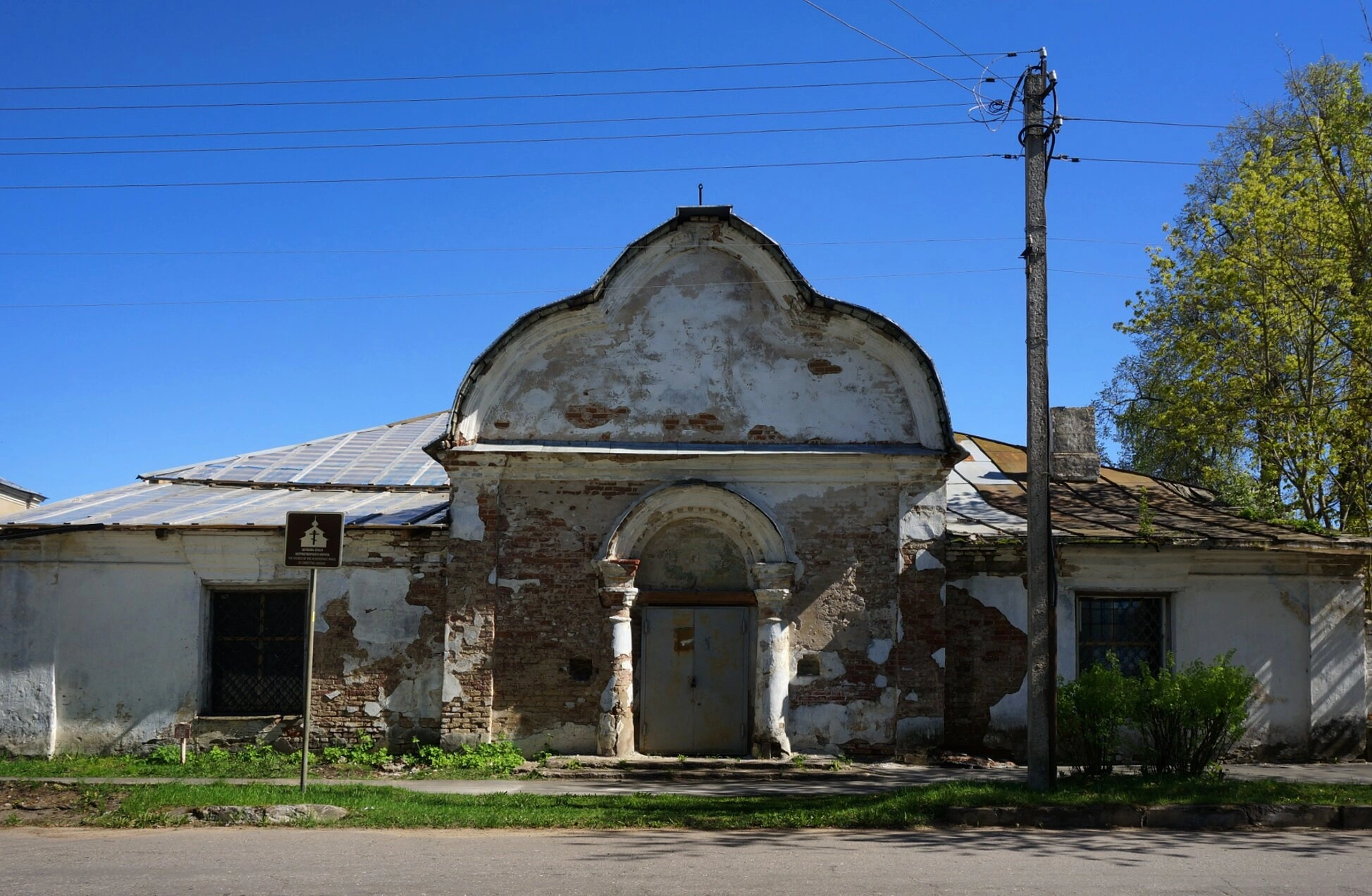 В непосредственной близости от входа в храм установлен указатель с изображением креста, свидетельствующий о сакральном назначении сооружения. Рядом со зданием просматривается столб линии электропередач, а на переднем плане видна грунтовая дорога и естественный травяной покров.