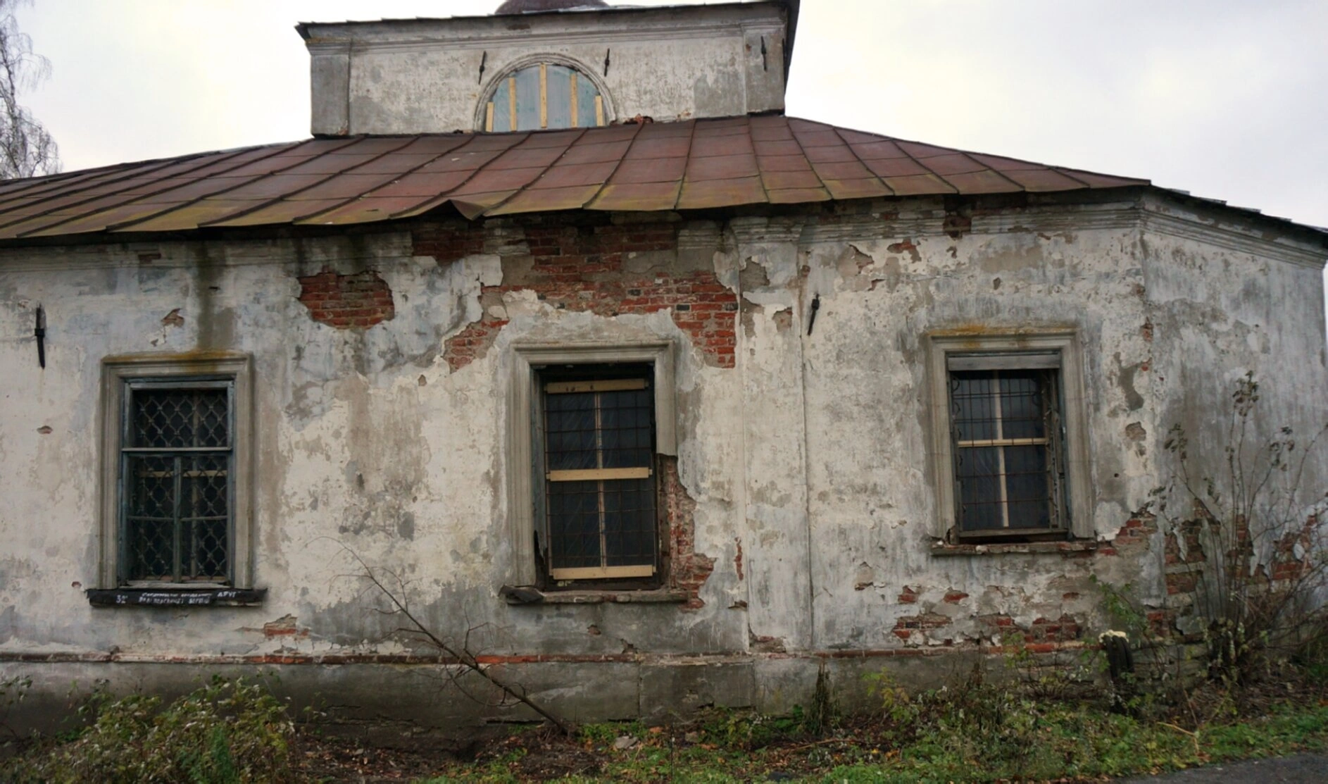 На представленной фотографии запечатлена Церковь Спаса Нерукотворного Образа, расположенная в историческом городе Новая Ладога Ленинградской области. Храмовая постройка демонстрирует характерные черты православной церковной архитектуры, однако находится в требующем реставрации состоянии.