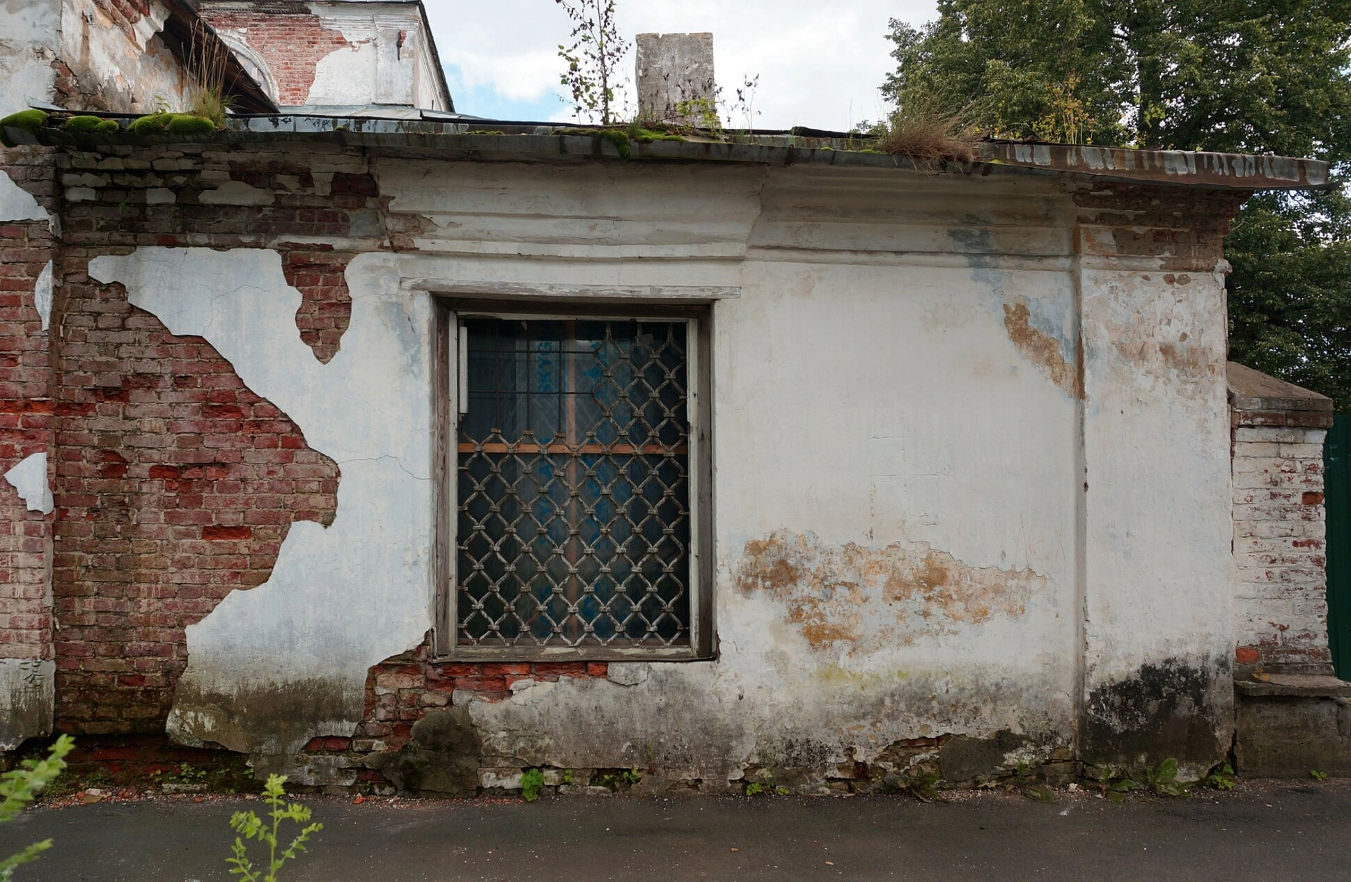 Особое внимание привлекает кирпичная кладка, частично обнаженная под слоем осыпавшейся штукатурки. Эта особенность свидетельствует о почтенном возрасте святыни, основанной в XVIII столетии. Металлическая решетка на окне подчеркивает традиционное для церковной архитектуры сочетание духовного назначения и необходимых мер сохранности.