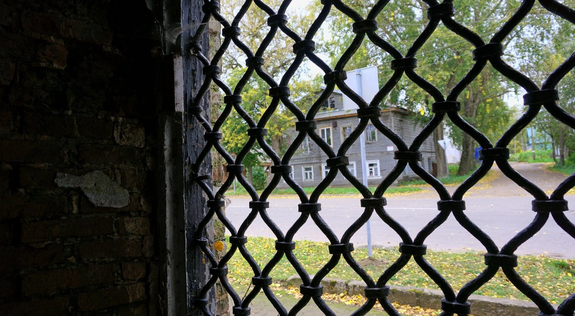 На представленной фотографии запечатлен уникальный ракурс Церкви Спаса Нерукотворного Образа, расположенной в историческом городе Новая Ладога. Снимок выполнен через старинную кованую решетку церковной ограды, создающую особое восприятие священного архитектурного ансамбля.