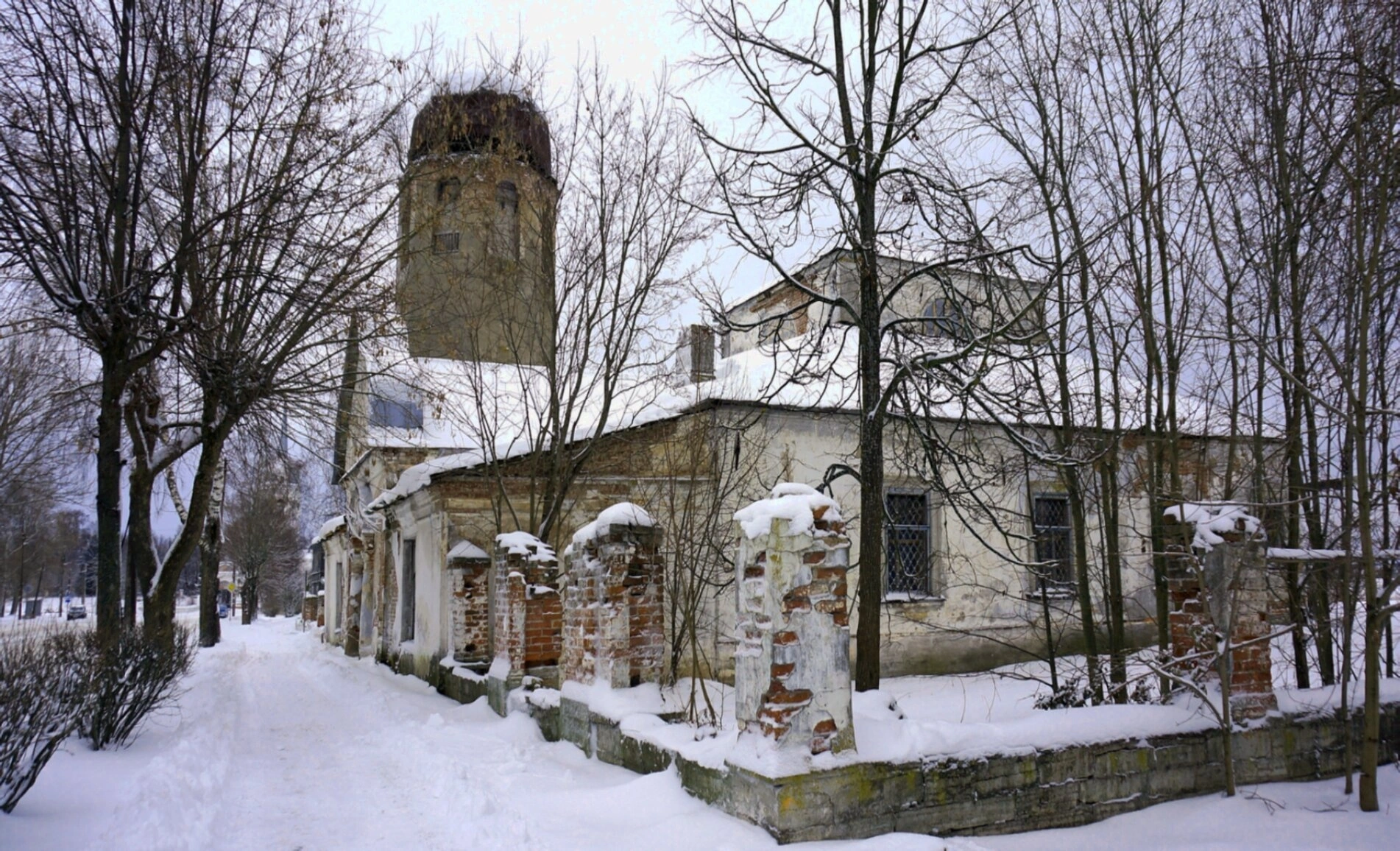 Фотография сделана в зимний период, что подчеркивает атмосферу забвения и запустения, окружающую этот некогда величественный храм. Снежный покров равномерно покрывает землю, крышу здания и ветви окружающих деревьев. Перед главным входом видна протоптанная тропинка, свидетельствующая о том, что к памятнику архитектуры occasionally наведываются местные жители и туристы.