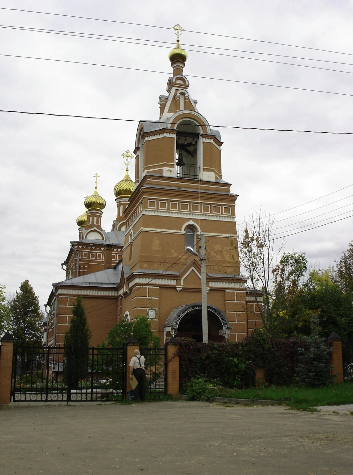 Церковь окружена металлическим ограждением, а на прихрамовой территории виднеются ухоженные зелёные насаждения - деревья и кустарники, создающие особую атмосферу духовного уединения. У входа в храм можно заметить человека, что позволяет оценить масштаб сооружения и подчеркивает его предназначение для молитвенного собрания верующих.