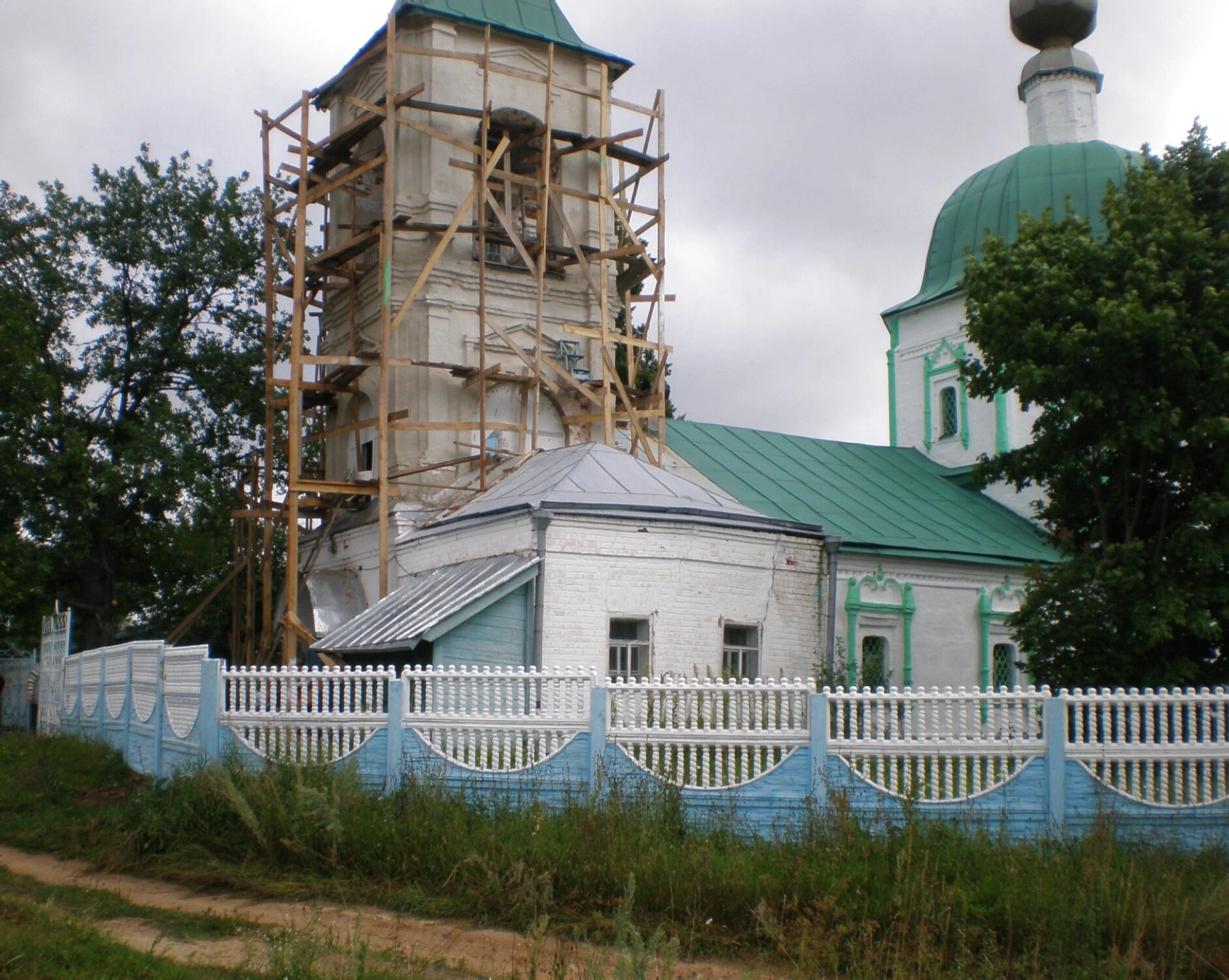 На снимке отчётливо виден весь архитектурный ансамбль: основное здание церкви, увенчанное зелёными куполами, и высокая колокольня, которая на момент съёмки находилась на реставрации. Наличие строительных лесов из дерева вокруг колокольни свидетельствует о проводимых работах по восстановлению этого духовного центра.
