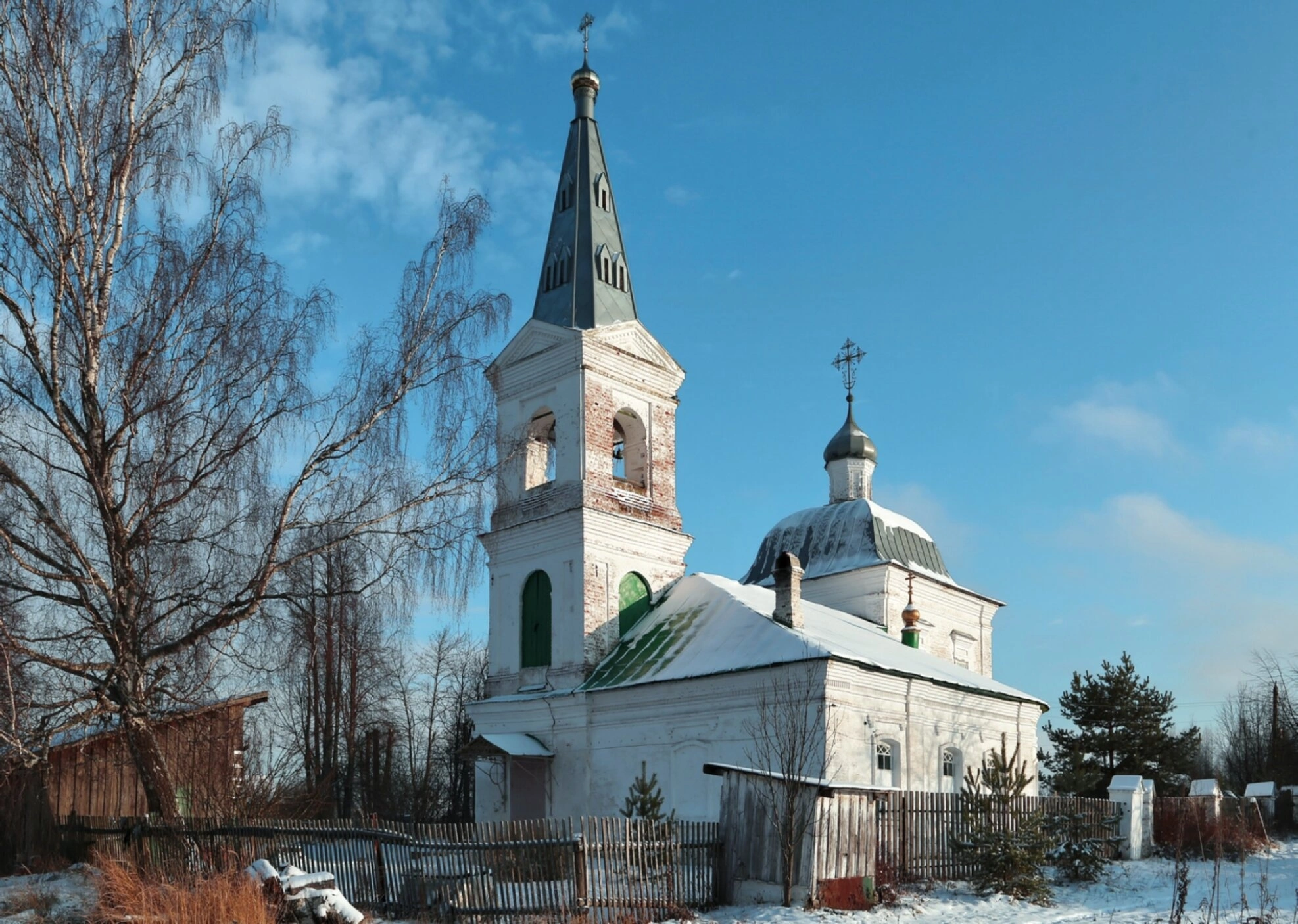 Храм окружен берёзами, сквозь оголённые ветви которых пробиваются солнечные лучи. Частично разрушенный деревянный забор по периметру церковной территории свидетельствует о почтенном возрасте данной святыни. Отсутствие листвы на деревьях и устойчивый снежный покров указывают на разгар зимы — возможно, период Рождественских святок или Крещенских морозов.
