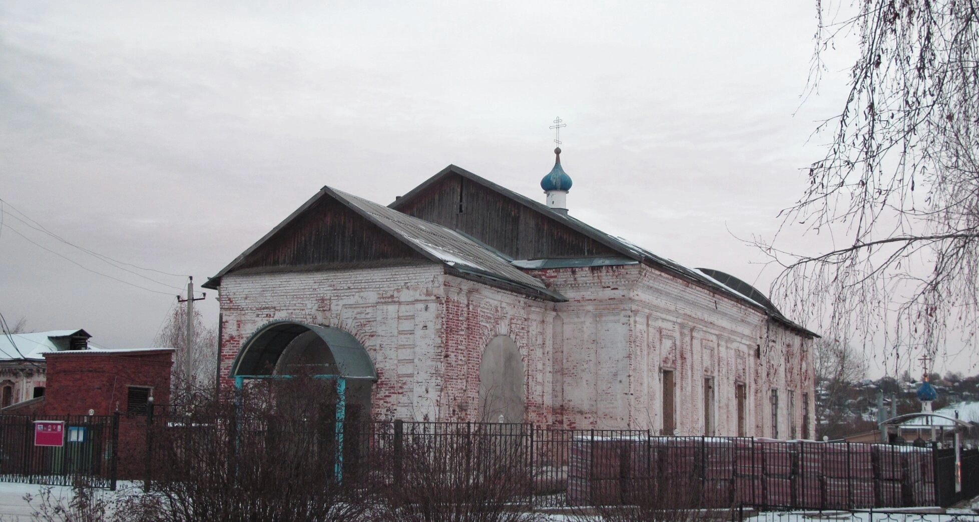 Стены святыни сложены из красного кирпича, частично оштукатурены и побелены, что создаёт гармоничный цветовой контраст. На некоторых участках фасада видна старая кирпичная кладка, свидетельствующая о богатой истории храма. Церковь обнесена невысокой оградой, за которой виднеются кустарники и деревья, сбросившие листву в зимний период.