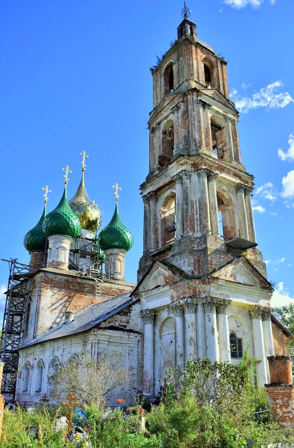 Рядом с основным зданием возвышается многоярусная колокольня, также сложенная из кирпича. На снимке видны следы её многовековой истории, требующие внимания и заботы. Значимым элементом кадра являются строительные леса, установленные на части сооружения, что свидетельствует о ведущихся реставрационных работах по сохранению этого святого места.