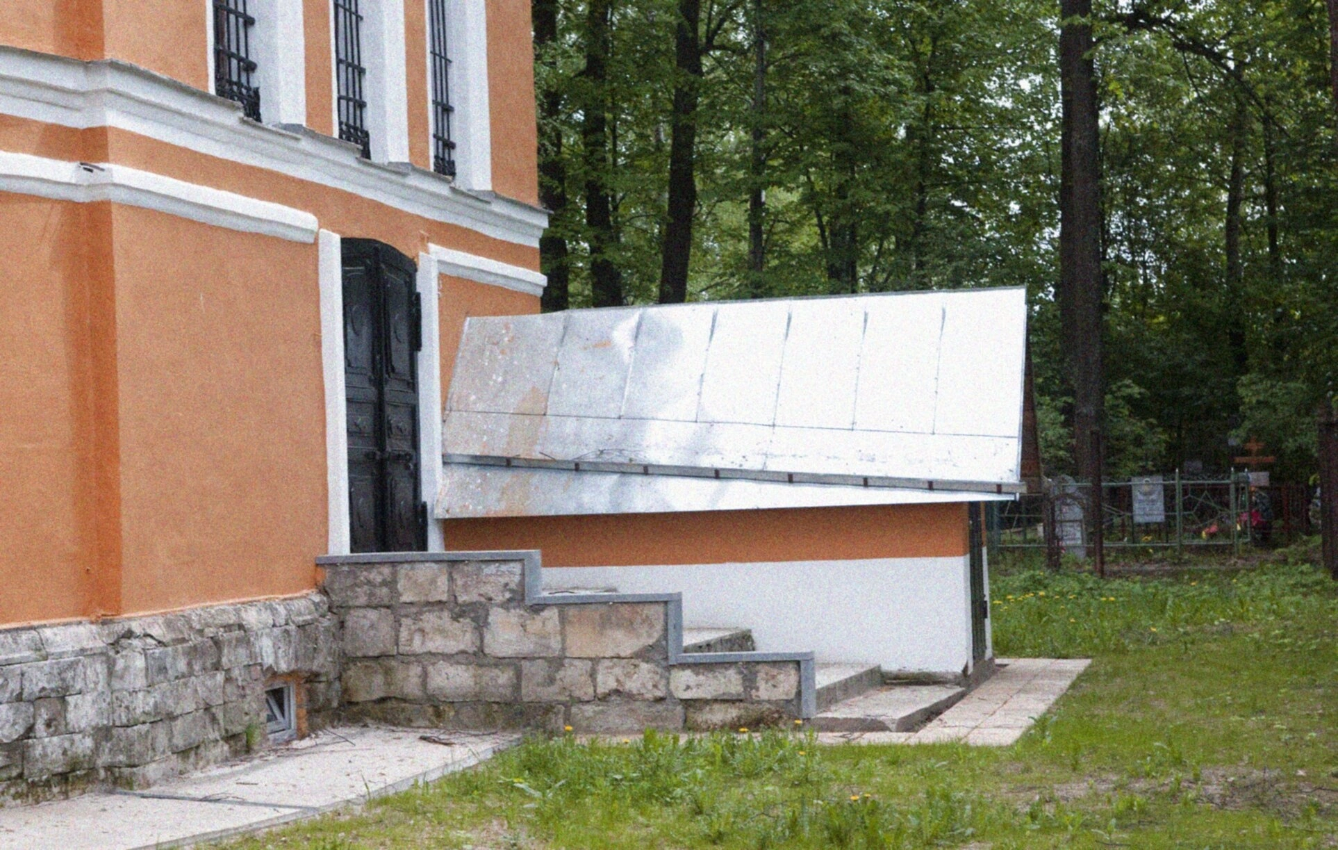 На фотографии запечатлена Церковь Спаса Нерукотворного Образа, расположенная в селе Спас-Торбеево Сергиево-Посадского района Московской области. Каменный храм был возведён в 1862–1866 годах на средства княжеской четы Сергея Семёновича и Татьяны Афанасьевны Урусовых . В архитектурном решении фасада, фрагмент которого виден на снимке, прослеживается стилистика эклектики. Светло-оранжевый оштукатуренный фасад контрастирует с белыми декоративными элементами, создавая торжественный и нарядный облик. К входной двери ведёт каменная лестница, нижняя часть которой сложена из необработанного камня, а верхние ступени — из более гладких блоков. Рядом со стеной основного объёма храма расположена невысокая пристройка под металлической кровлей, служащая защитным навесом над входом. На заднем плане, за деревьями, находится церковное кладбище — неотъемлемая часть истории этого святого места. Под самим храмом была устроена усыпальница князей Урусовых, что добавляет месту особую историческую и мемориальную ценность . Исторически этому месту благоволил великий русский писатель Лев Николаевич Толстой, который в 1889 году гостил в имении Урусовых и работал здесь над своими произведениями . Первоначально на этом месте стояла деревянная церковь, построенная в начале XVIII века при князе Юрии Фёдоровиче Шаховском, но до наших дней она не сохранилась . Храм был закрыт в советские времена, но возвращён верующим в 1995 году и ныне является действующим .