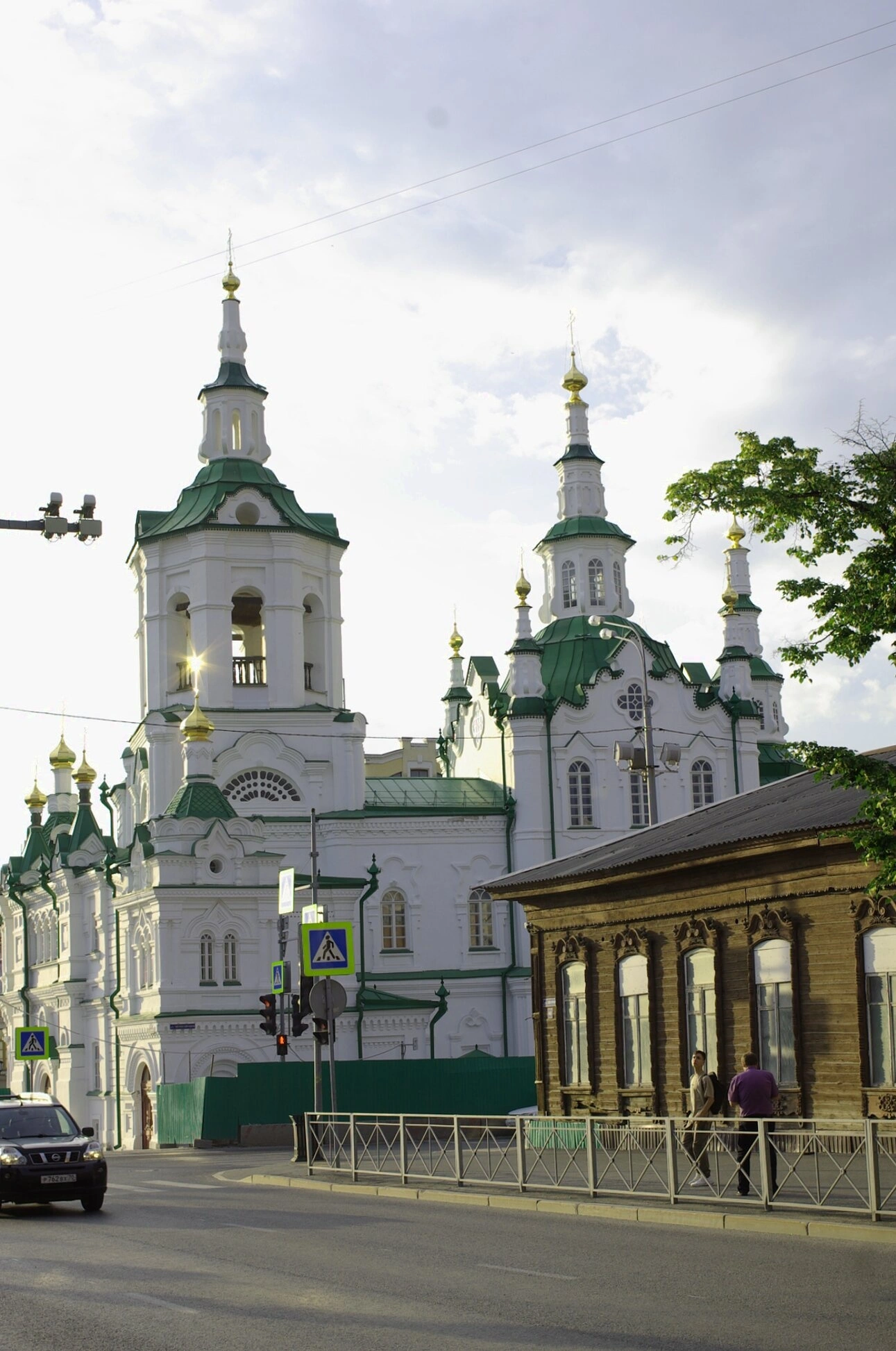 На представленной фотографии запечатлена жемчужина сибирского зодчества — Церковь Спаса Нерукотворного Образа, расположенная в историческом центре Тюмени. Этот храм, основанный в 1796 году на месте сгоревшей деревянной церкви, является одним из древнейших каменных сооружений города и ярчайшим памятником архитектуры, сочетающим элементы сибирского барокко и русского стиля.
